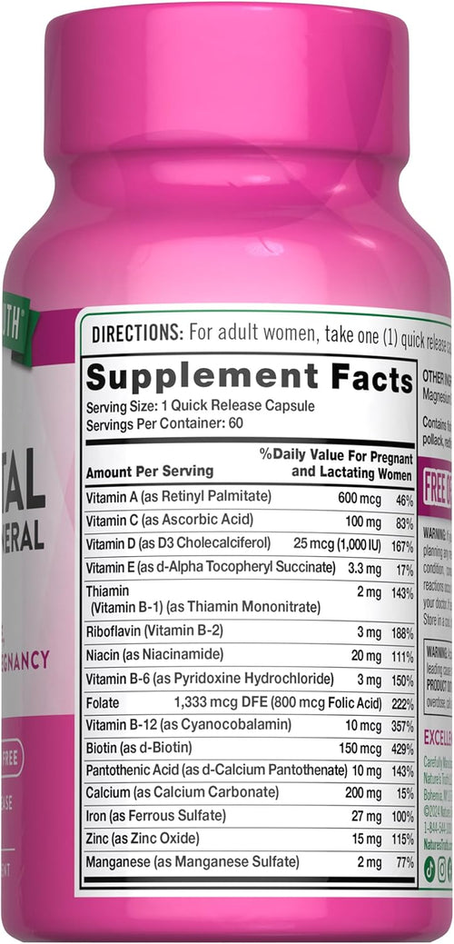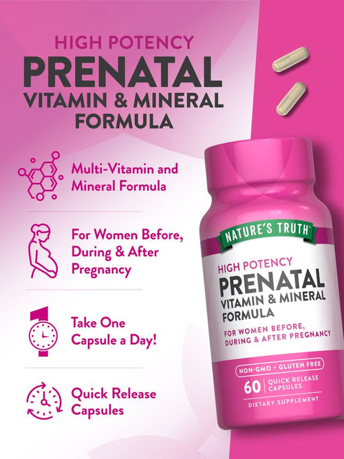 Nature’s Truth Prenatal Vitamin & Mineral Formula delivers over 10 essential nutrients for women, including 800 mcg of Folic Acid per serving. One quick release capsule per day also supplies Iron, Zinc, Calcium, and a variety of letter vitamins for comprehensive support. This prenatal multivitamin is beneficial for women to take before, during, and after pregnancy.