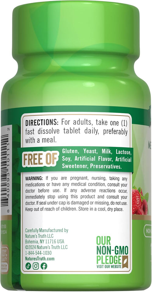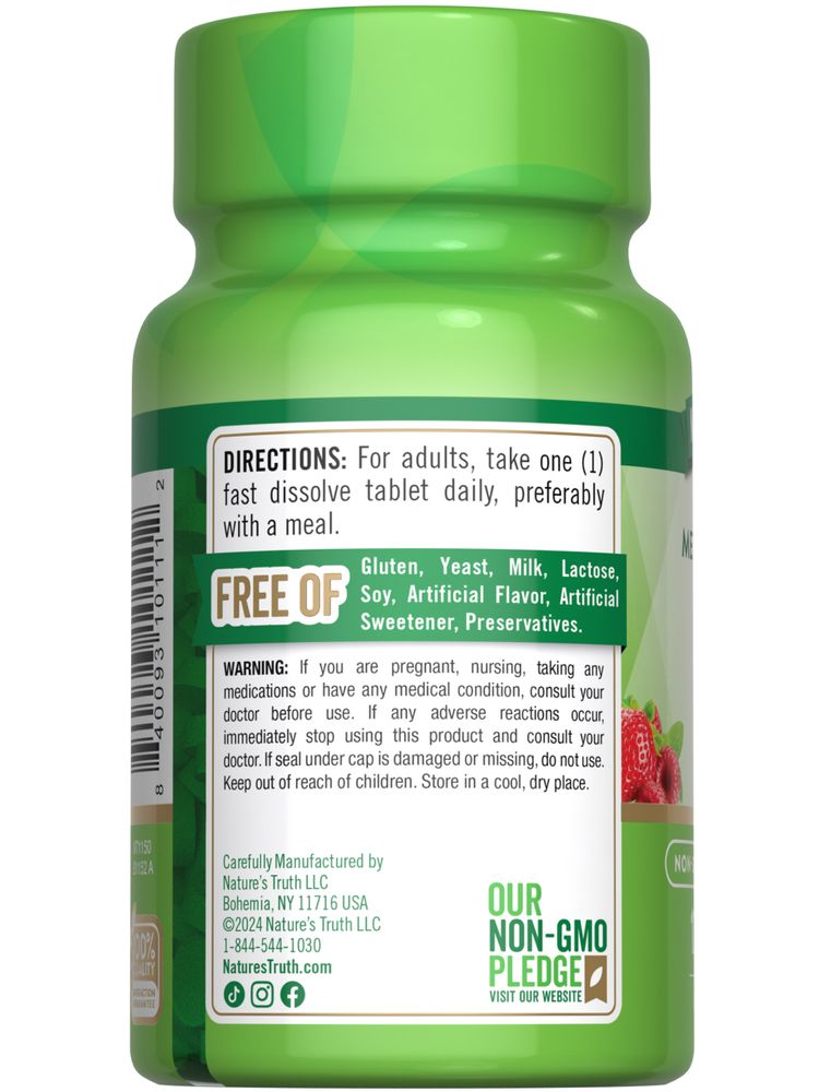 Nature's Truth bietet jetzt ein speziell entwickeltes Vitamin B12 (Methylcobalamin)-Nahrungsergänzungsmittel für die tägliche Unterstützung an. Jede Tablette liefert 1.000 mcg dieses essenziellen B-Vitamins in einer schnell löslichen Tablette. Unsere vegetarische Formel ist gentechnikfrei und frei von Gluten, künstlichen Aromen und Konservierungsstoffen. Nature's Truth bemüht sich, Ihnen die reinsten Nahrungsergänzungsmittel aus vertrauenswürdigen Quellen zu einem besten Preis anzubieten!