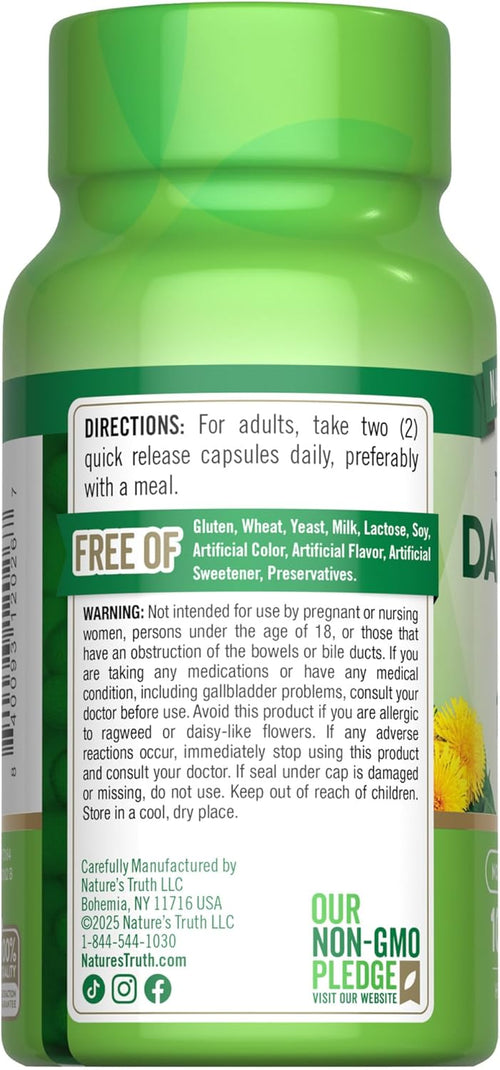 Unsere Mission bei Nature’s Truth ist es, Ihre Wellness-Bedürfnisse mit Produkten zu erfüllen, die weit über die Erwartungen hinausgehen. Nature’s Truth bietet Nahrungsergänzungsmittel in verschiedenen Darreichungsformen an, wie Kapseln, Softgelkapseln, Kaubonbons, Tabletten, Pulver, Flüssigkeiten und Gummis, um jeder Vorliebe gerecht zu werden. Unsere Löwenzahnwurzelkapsel ist gentechnikfrei und frei von Gluten, Weizen, Hefe, Milch, Laktose, Soja, künstlicher Farbe, künstlichem Geschmack, künstlichem Süßstoff und Konservierungsmitteln.