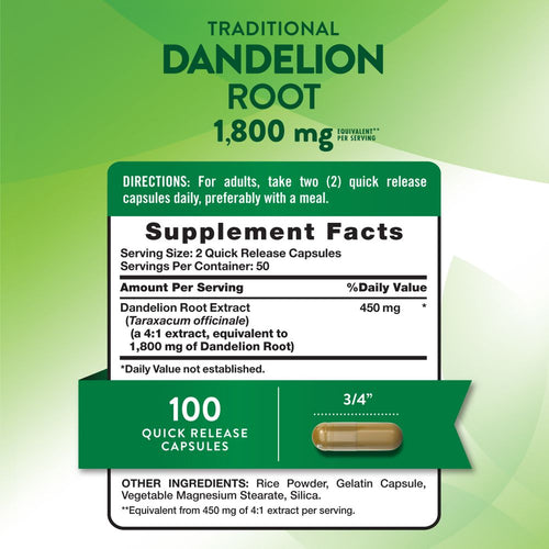 Jede Portion unserer Löwenzahnwurzelkapseln liefert das Äquivalent von 1.800 mg Löwenzahnwurzel.** Diese schnell freisetzende, pflanzliche Formel stellt sicher, dass Sie die vollen Vorteile dieses Kräuterergänzungsmittels mit nur zwei Kapseln täglich erhalten.