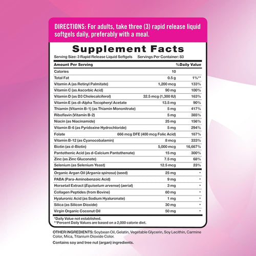 Entfesseln Sie Ihre innere Schönheit mit diesen Softgels für Haare, Haut und Nägel. Jede Portion liefert eine Vielzahl nützlicher Vitamine und Mineralien, darunter 5.000 mcg Biotin, sowie Vitamin C, Vitamin E und mehr. Diese Softgels bieten zudem zusätzliche Unterstützung durch Arganöl, Kollagen und Kokosnussöl.