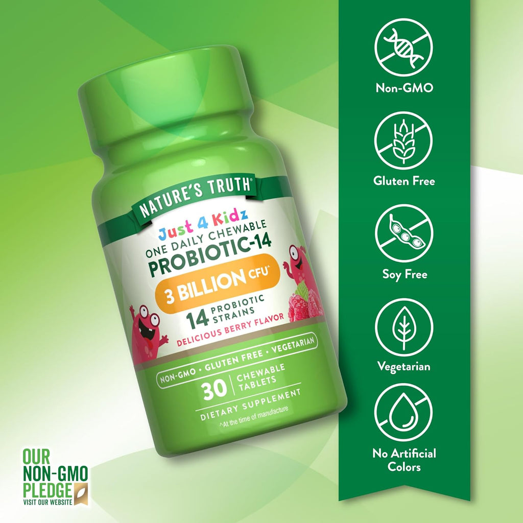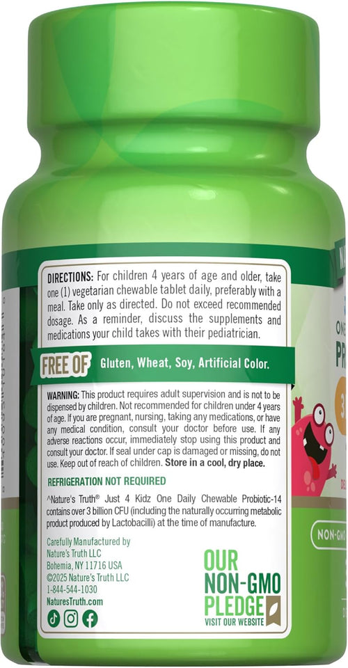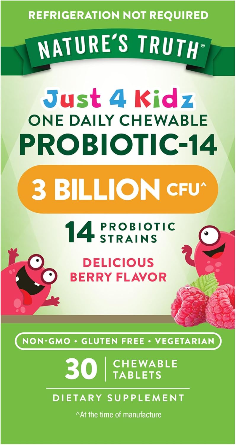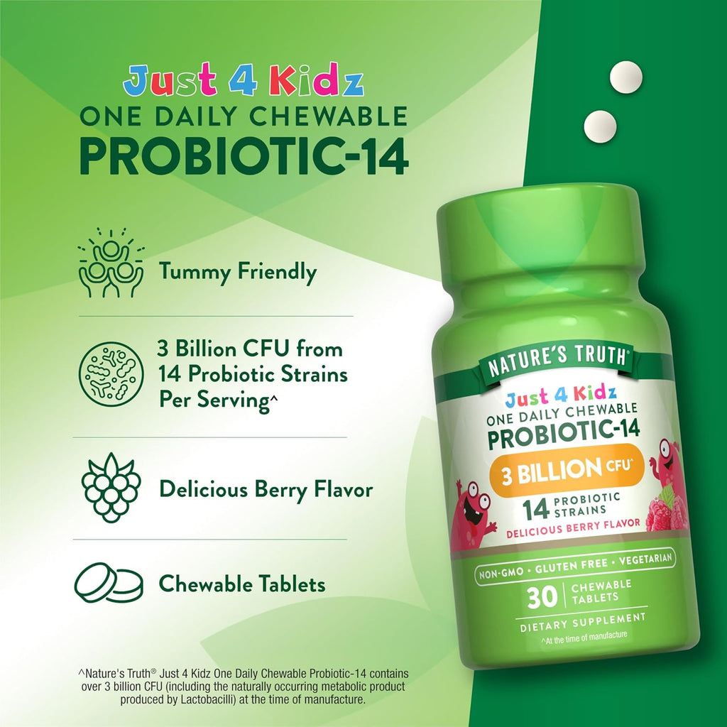 Eine Portion unserer Just 4 Kidz One Daily Chewable Probiotic-14 Tabletten liefert 3 Milliarden KBE und 14 probiotische Stämme.** Diese kaubaren Tabletten sind vegetarierfreundlich und haben einen köstlichen Beerengeschmack, den Kinder lieben werden. Kinder ab 4 Jahren können täglich eine Tablette kauen.