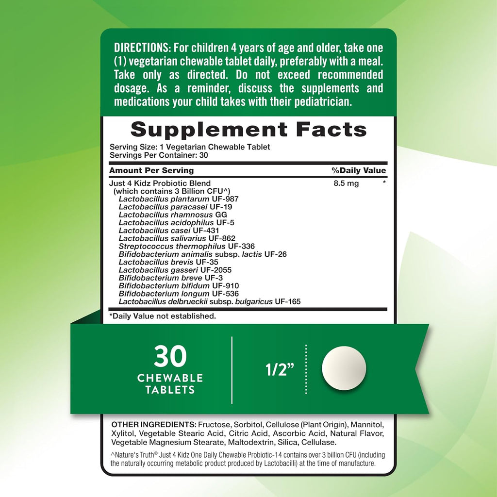 **Nature’s Truth Just 4 Kidz One Daily Chewable Probiotic-14 enthält über 3 Milliarden KBE (einschließlich des natürlich vorkommenden Stoffwechselprodukts, das von Laktobazillen produziert wird) zum Zeitpunkt der Herstellung.
