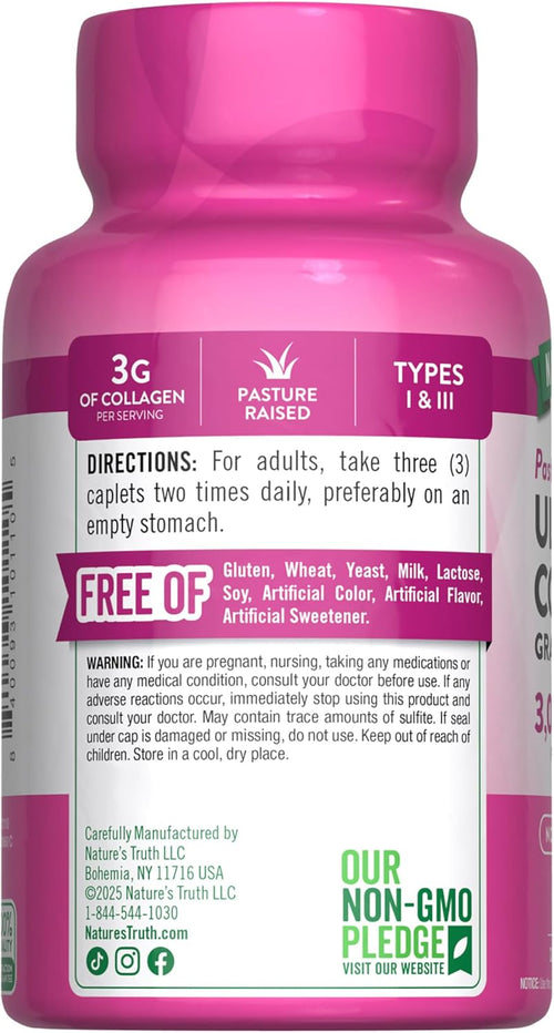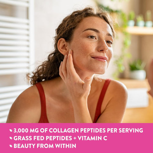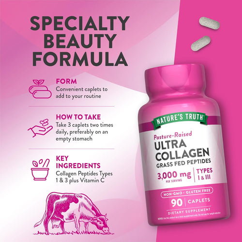Cada porción de nuestras capletas Ultra Collagen ofrece 3,000 mg de péptidos de colágeno tipo I y III de bovinos criados en pastos y alimentados con pasto, además de 30 mg de vitamina C. Estas capletas fáciles de tomar pueden añadirse a tu rutina diaria para elevar tu belleza desde el interior.