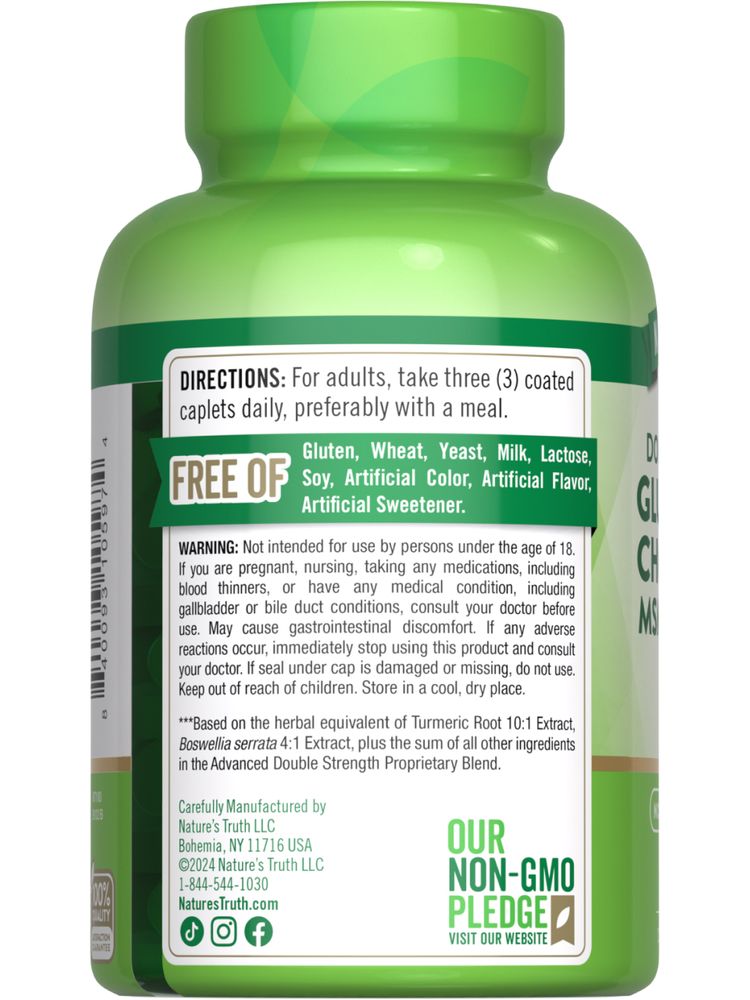 Cada porción de nuestras Capletas Complejas de Glucosamina Condroitina de Doble Fuerza ofrece 1,500 mg de Sulfato de Glucosamina 2KCl y un equivalente total de 1,200 mg de una Mezcla Propietaria de Doble Fuerza Avanzada, que incluye MSM, Condroitina, Cúrcuma y otros compuestos esenciales.*** Los adultos pueden tomar tres capletas recubiertas al día, preferiblemente con una comida, para aprovechar todos sus beneficios.