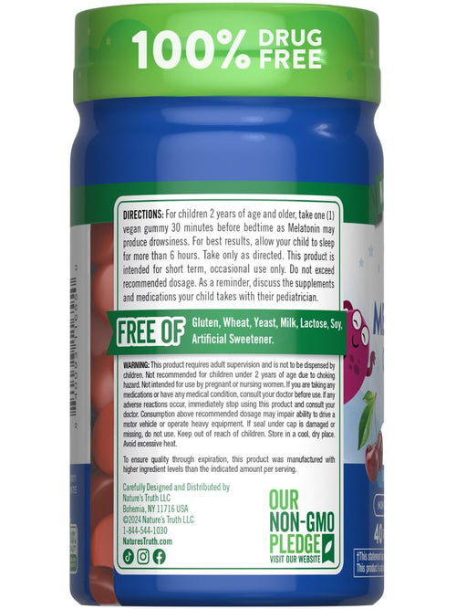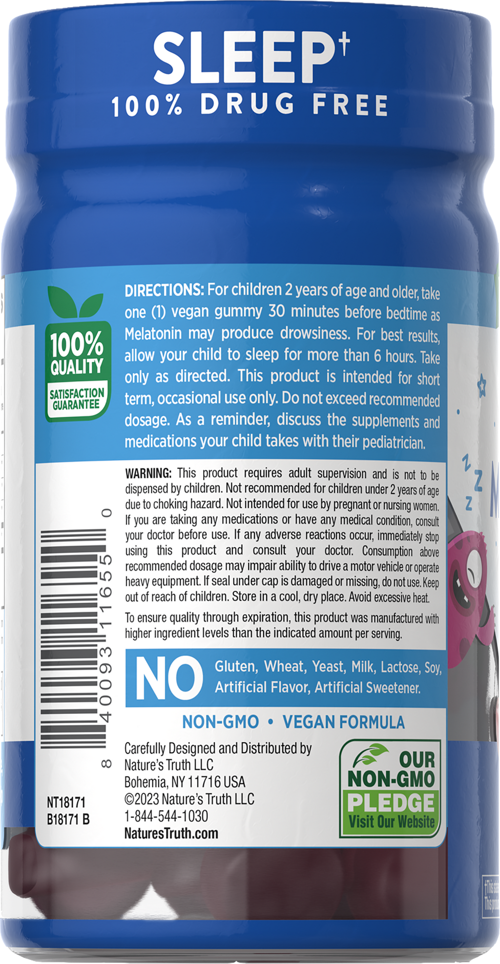 Nuestra misión en Nature’s Truth es satisfacer tus necesidades de bienestar con productos que van más allá. Nature’s Truth ofrece suplementos en varias formas de entrega, como cápsulas, softgels, masticables, tabletas, polvos, líquidos y gomitas para adaptarse a cada preferencia. Nuestra Melatonina para Niños es vegana, no transgénica y libre de gluten, trigo, levadura, leche, lactosa, soya y edulcorantes artificiales.