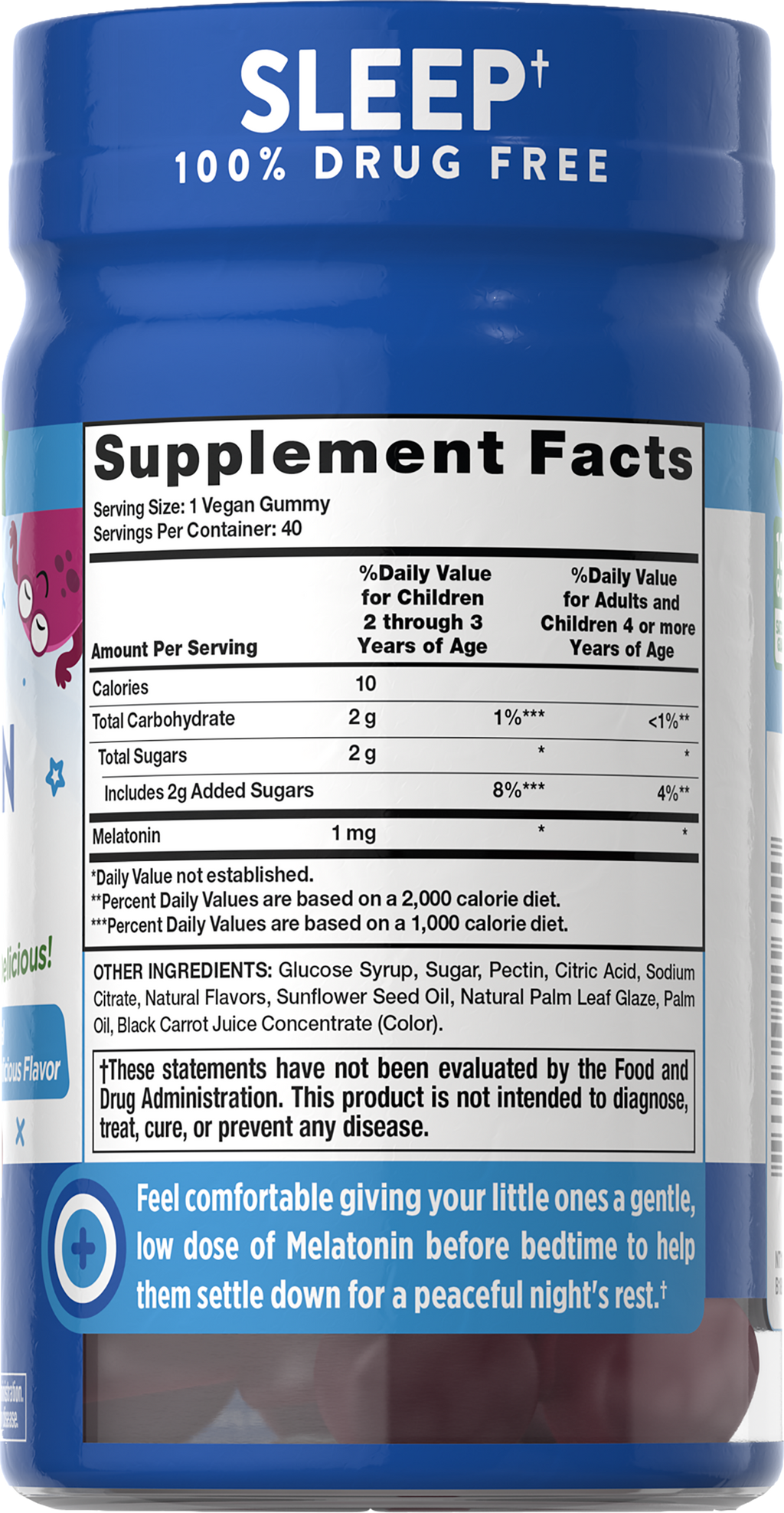 Cada porción de nuestras Gomitas de Melatonina para Niños ofrece 1 mg de Melatonina. Estas gomitas veganas tienen un delicioso sabor a cereza que a los niños les encantará. La melatonina puede usarse para el insomnio ocasional y nuestra fórmula es 100% libre de drogas, lo que te permite dárselas a tus pequeños con tranquilidad.†