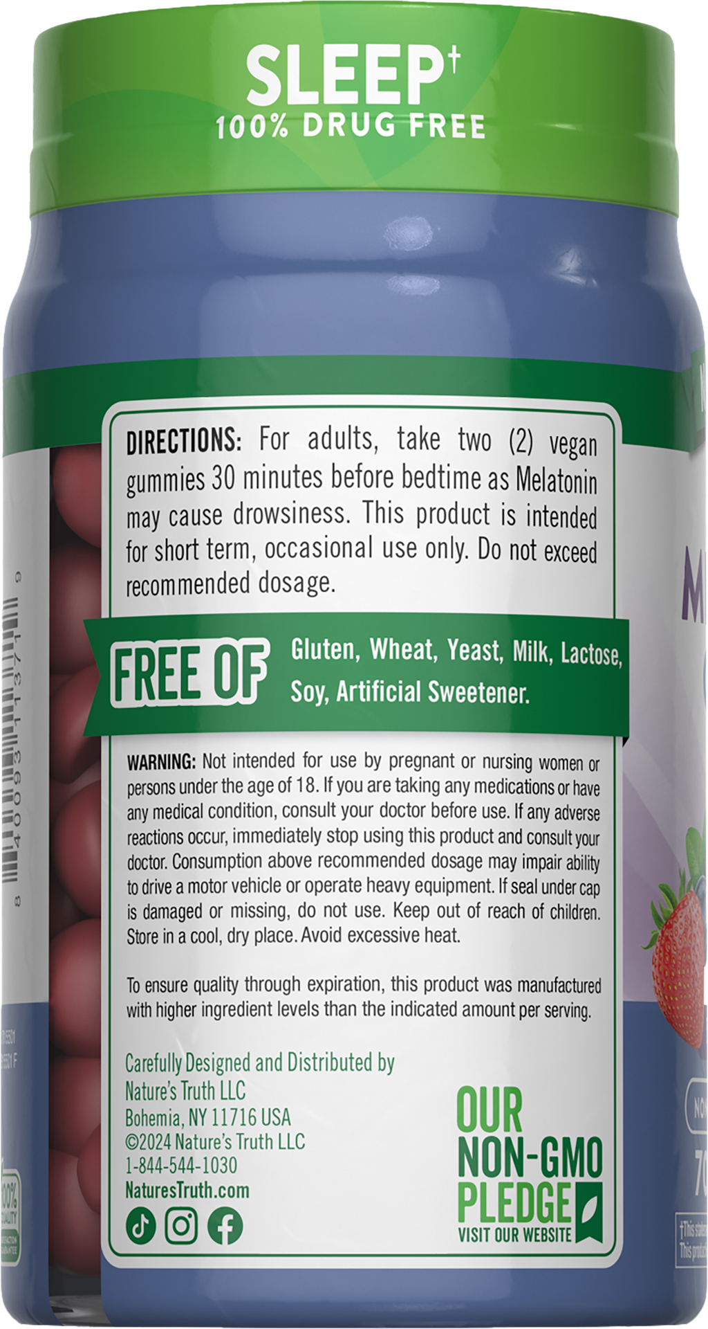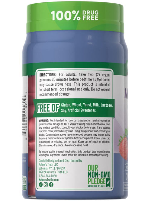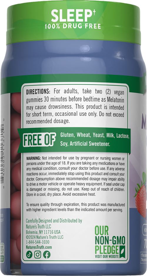 Nuestra misión en Nature’s Truth es satisfacer tus necesidades de bienestar con productos que van más allá de lo común. Nature’s Truth ofrece suplementos en varias formas de presentación, como cápsulas, cápsulas blandas, masticables, tabletas, polvos, líquidos y gomitas para adaptarse a todas las preferencias. Nuestra melatonina es vegana, no contiene OGM, ni gluten, trigo, levadura, leche, lactosa, soya ni edulcorantes artificiales.