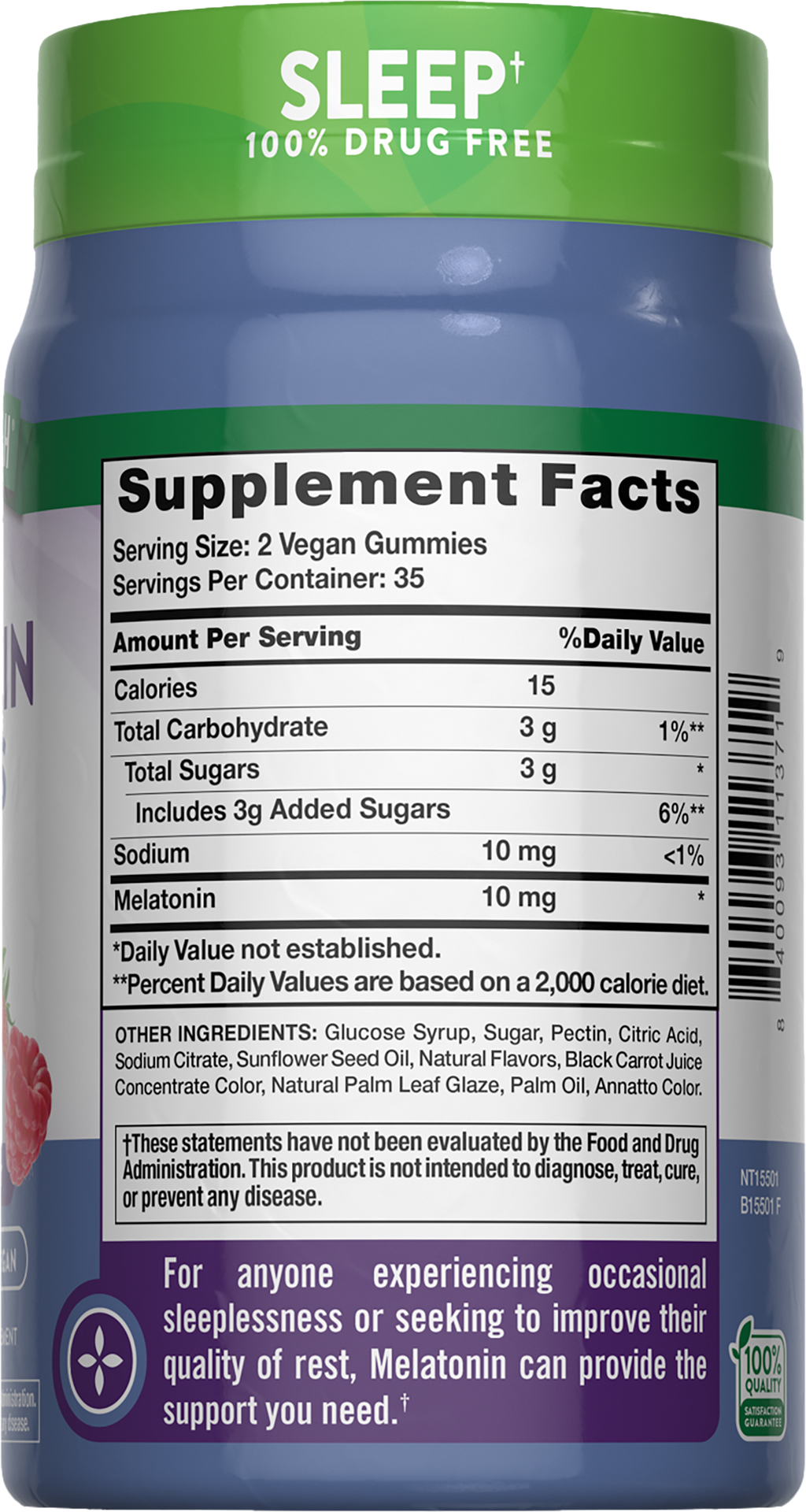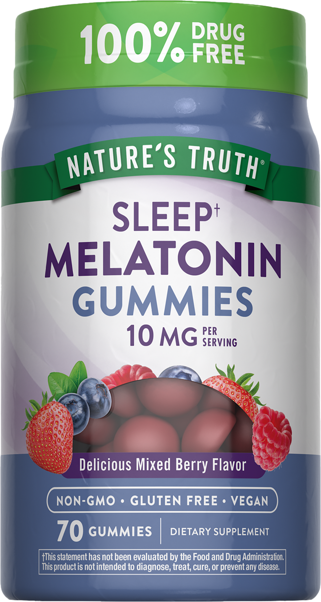 Cada porción de nuestras gomitas de melatonina proporciona 10 mg de melatonina. Estas gomitas veganas tienen un delicioso sabor a bayas mixtas y son una excelente alternativa para quienes no les gustan o tienen dificultades para tragar píldoras. Nuestra fórmula no contiene medicamentos y puede usarse para la falta de sueño ocasional.†