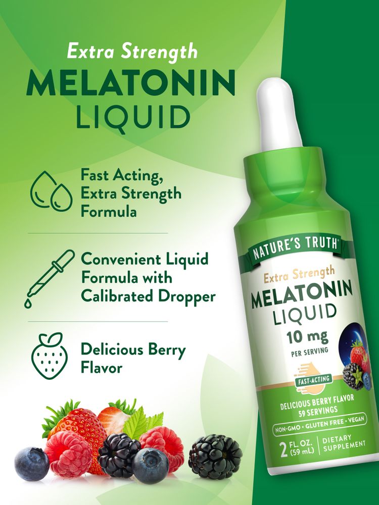 El Líquido de Melatonina de Fuerza Extra de Nature’s Truth ofrece 10 mg de Melatonina por porción, en una fórmula líquida de acción rápida con un delicioso sabor a frutas del bosque. Los adultos pueden tomar 1 mL 30 minutos antes de acostarse para un apoyo de fuerza extra.