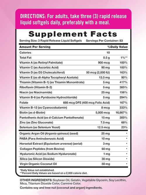 Libérez votre beauté intérieure avec ces softgels pour Cheveux, Peau & Ongles. Chaque portion offre un éventail de vitamines et minéraux bénéfiques, dont 5 000 mcg de Biotine, ainsi que de la Vitamine C, de la Vitamine E, et plus encore. Ces softgels fournissent également un soutien supplémentaire grâce à l'Huile d'Argan, au Collagène et à l'Huile de Coco.