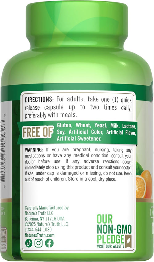 Nature’s Truth Vitamine C offre 1000 mg de vitamine C essentielle par capsule à libération rapide. Chaque portion fournit 20 mg de bioflavonoïdes d'agrumes et 5 mg de cynorrhodon, deux phytonutriments naturels qui offrent un soutien supplémentaire. Une capsule peut être prise jusqu'à deux fois par jour, de préférence pendant les repas.