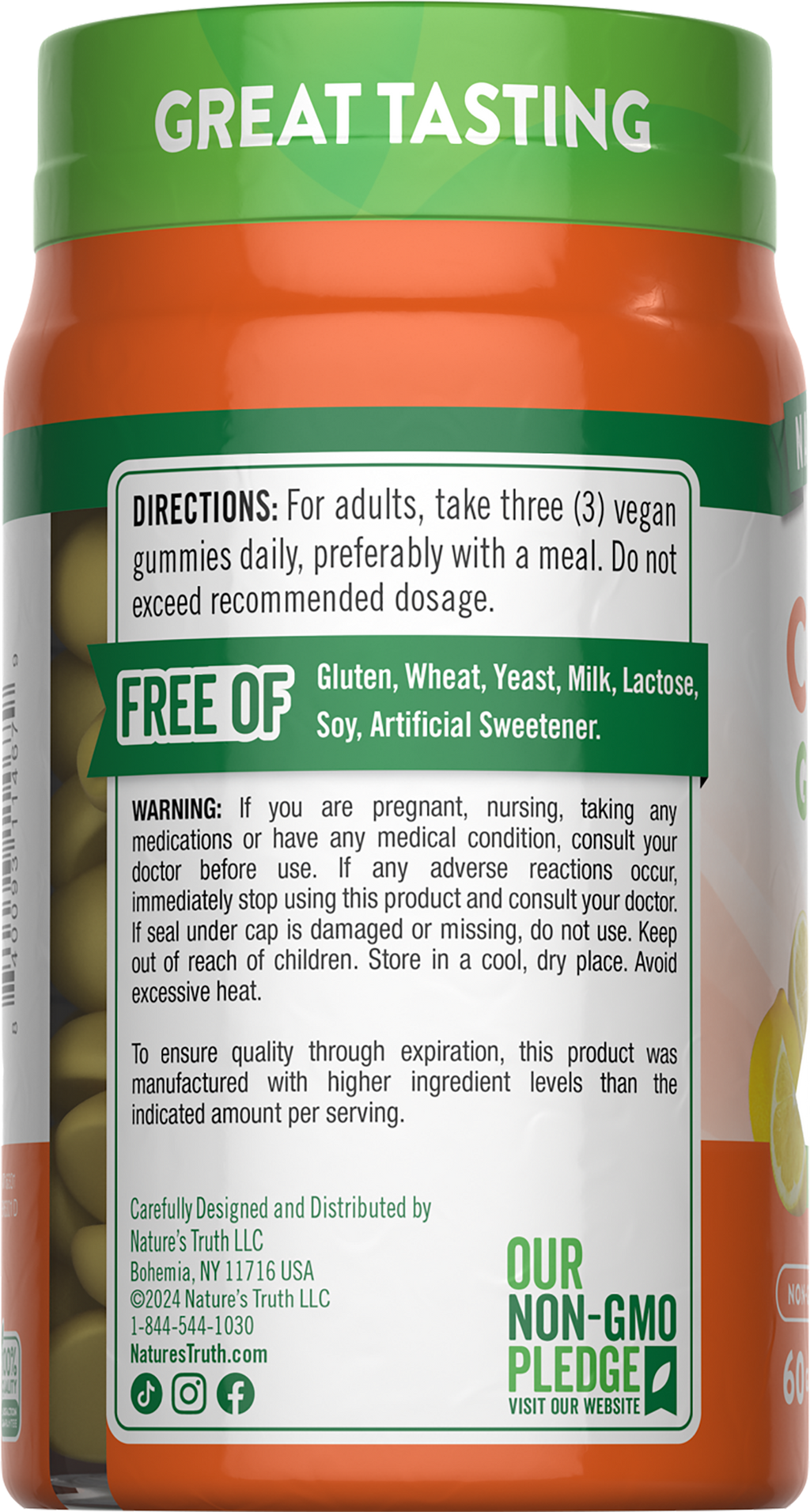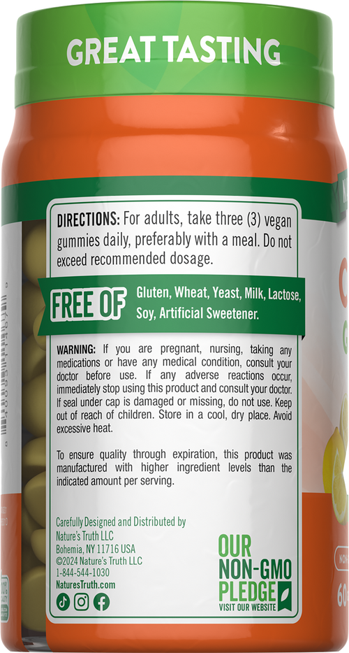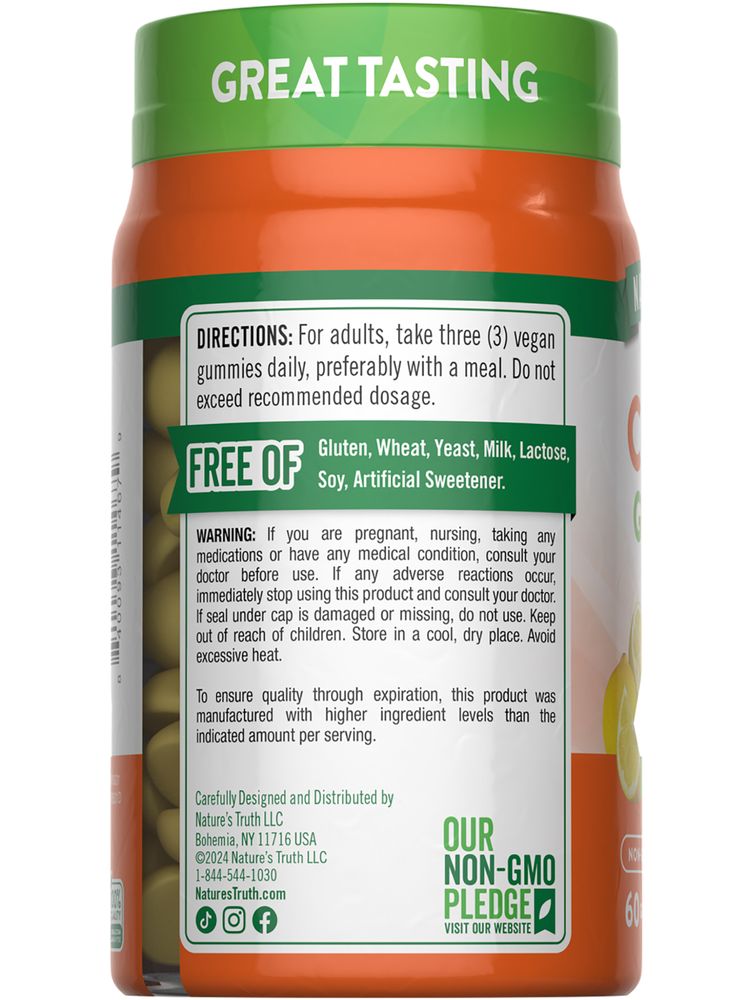 Notre mission chez Nature's Truth est de répondre à vos besoins en matière de bien-être avec des produits qui vont au-delà des attentes. Nature's Truth propose des compléments sous diverses formes d'administration, telles que des capsules, des capsules molles, des comprimes à mâcher, des tablettes, des poudres, des liquides et des gummies pour convenir à toutes les préférences. Notre C + Zinc est végétalien, sans OGM, et sans gluten, blé, levure, lait, lactose, soja et édulcorant artificiel.