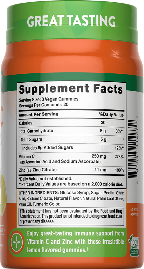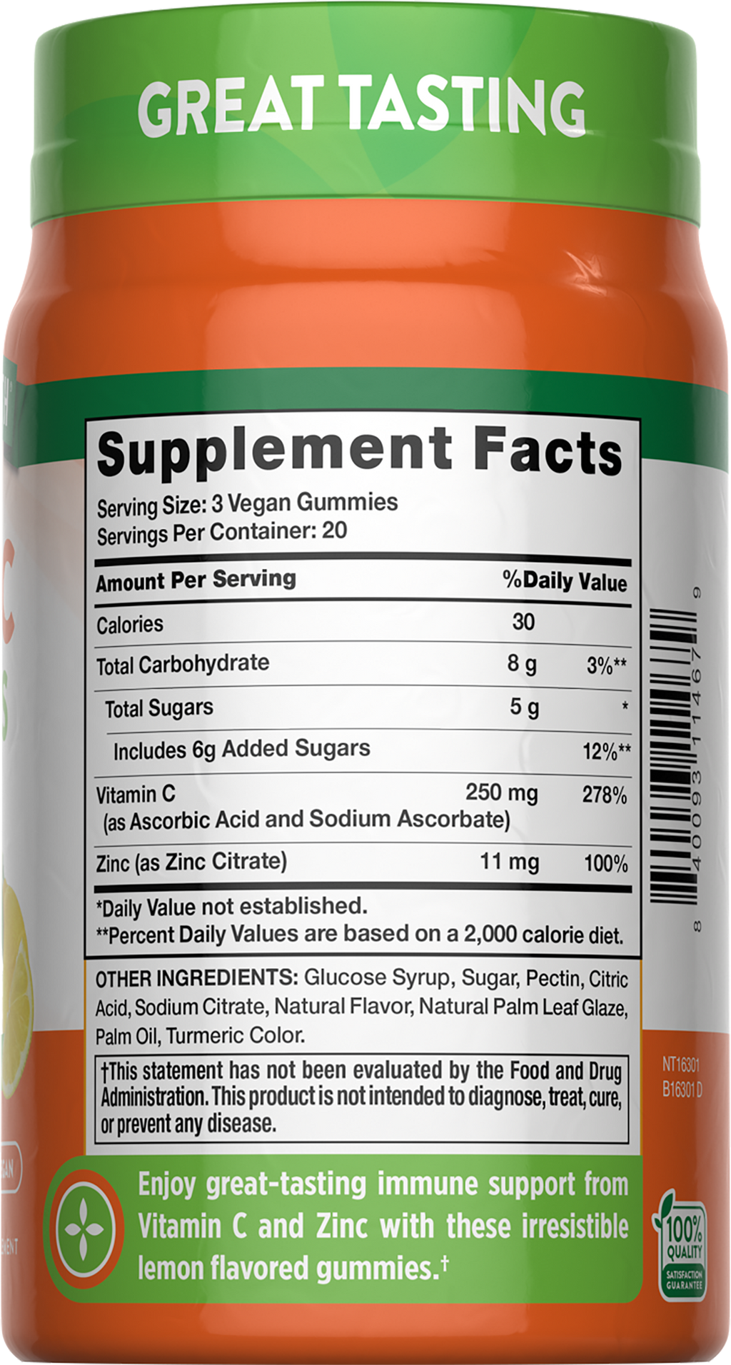 Chaque portion de nos gummies C + Zinc fournit 250 mg de vitamine C (sous forme d'acide ascorbique et d'ascorbate de sodium) et 11 mg de zinc (sous forme de citrate de zinc). Cette formule vous offre au moins 100 % de la valeur quotidienne recommandée de la vitamine C essentielle et du minéral essentiel zinc. Ces gummies véganes ont une délicieuse saveur de citron, ce qui les rend absolument agréables à prendre. Les vitamines en gummy sont également une excellente alternative pour ceux qui n'aiment pas ou ont des difficultés à avaler des comprimés.