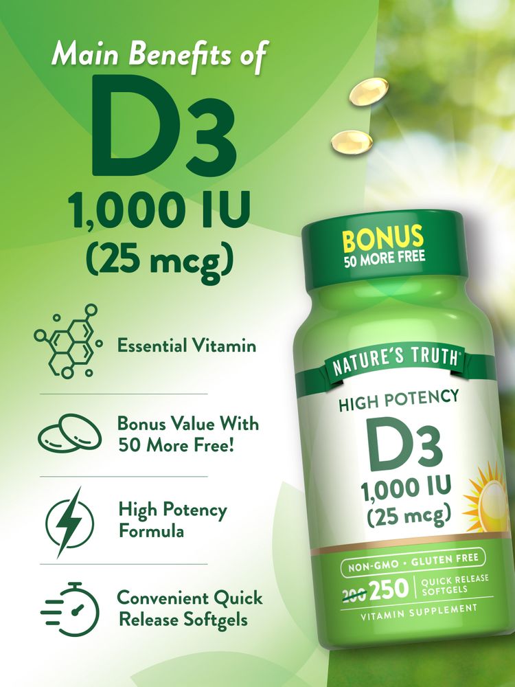Chaque portion de nos softgels de Vitamine D3 fournit 1 000 UI ou 25 mcg de Vitamine D (sous forme de D3 Cholecalciférol). Cette formule à haute puissance peut facilement être intégrée dans votre routine quotidienne. Un seul softgel à libération rapide par jour suffit pour atteindre la valeur quotidienne recommandée de cette vitamine essentielle.