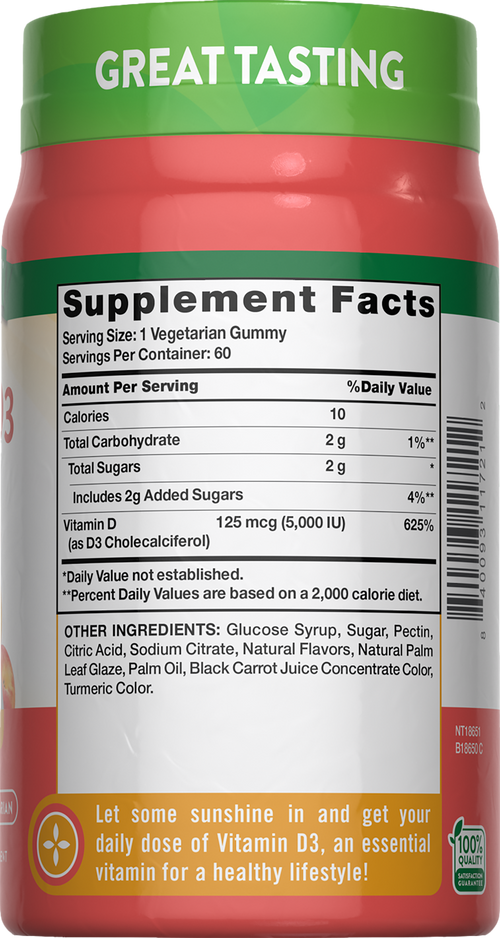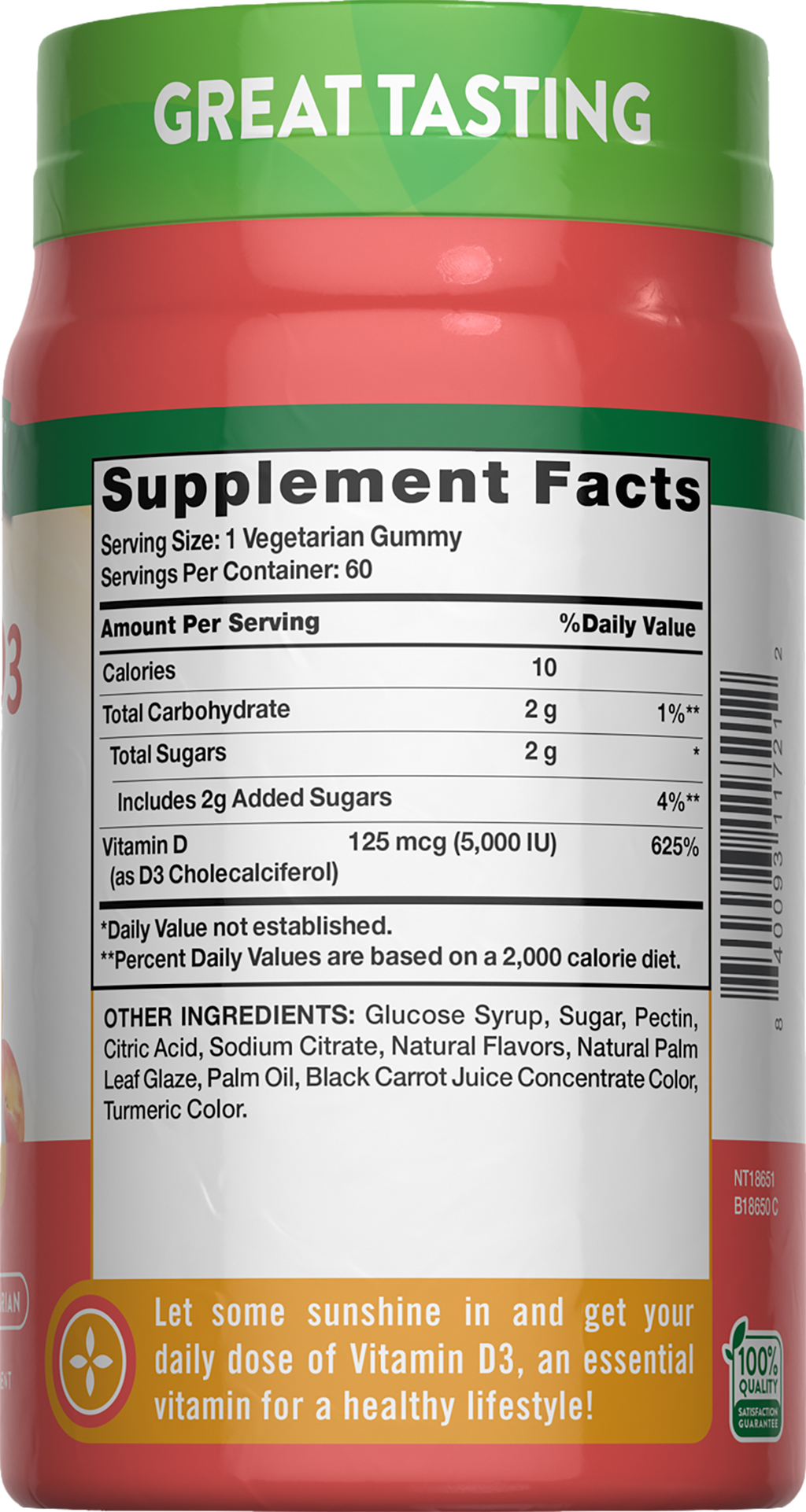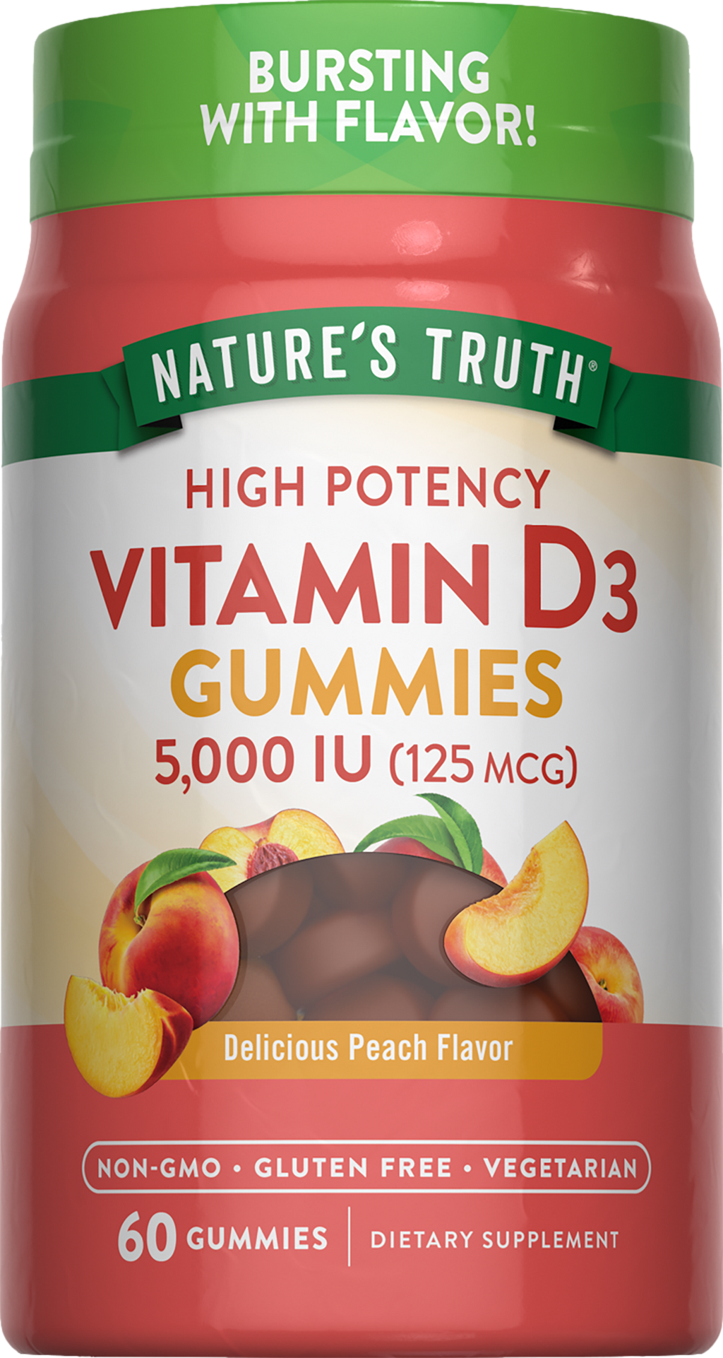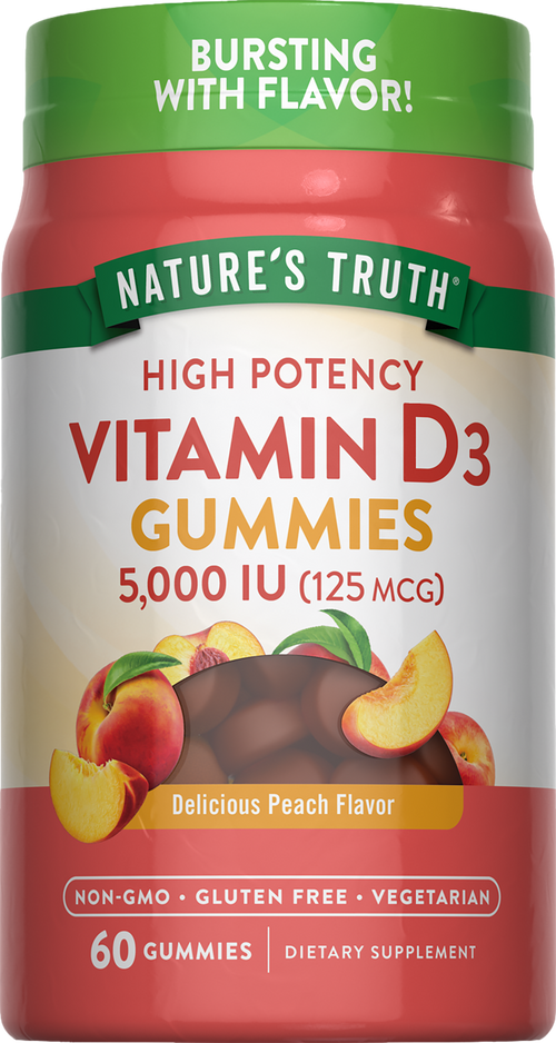 Chaque portion de nos gélifiés de vitamine D3 à haute puissance fournit 125 mcg ou 5 000 UI de vitamine D sous forme de cholécalciférol D3. Ces gélifiés végétariens ont un délicieux goût de pêche et sont une excellente alternative pour ceux qui n'aiment pas ou ont des difficultés à avaler des comprimés. Un seul gélifié par jour suffit.