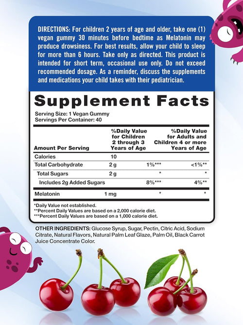 Ogni porzione delle nostre Gommosi di Melatonina per Bambini fornisce 1 mg di melatonina. Queste gommosi vegane hanno un sapore di ciliegia che i bambini ameranno di sicuro. La melatonina può essere utilizzata per l'insonnia occasionale e la nostra formula è al 100% priva di farmaci, così ti sentirai a tuo agio nel darla ai tuoi piccoli.†