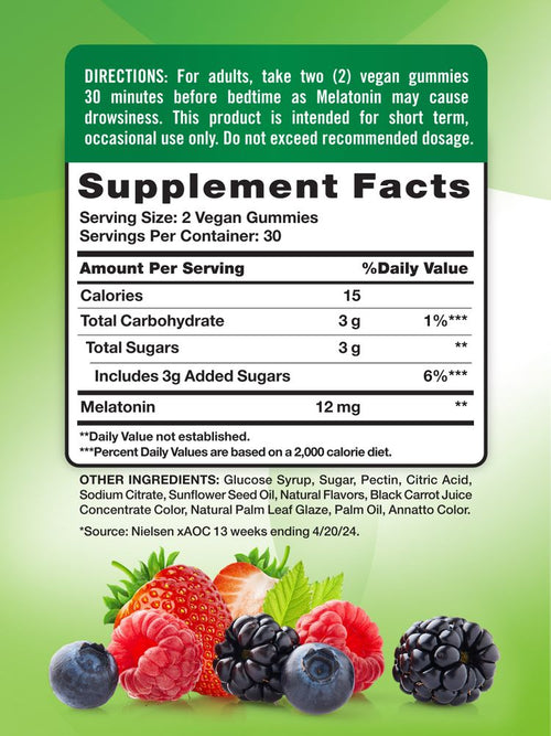 Ogni porzione dei nostri gommini di Melatonina fornisce 12 mg di Melatonina. Questi gommini vegani hanno un delizioso sapore di frutti di bosco misti e sono una meravigliosa alternativa per quelli a cui non piacciono o hanno difficoltà a deglutire pillole. La nostra formula a massima forza è priva al 100% di farmaci e può essere utilizzata per occasionali insonnie.†