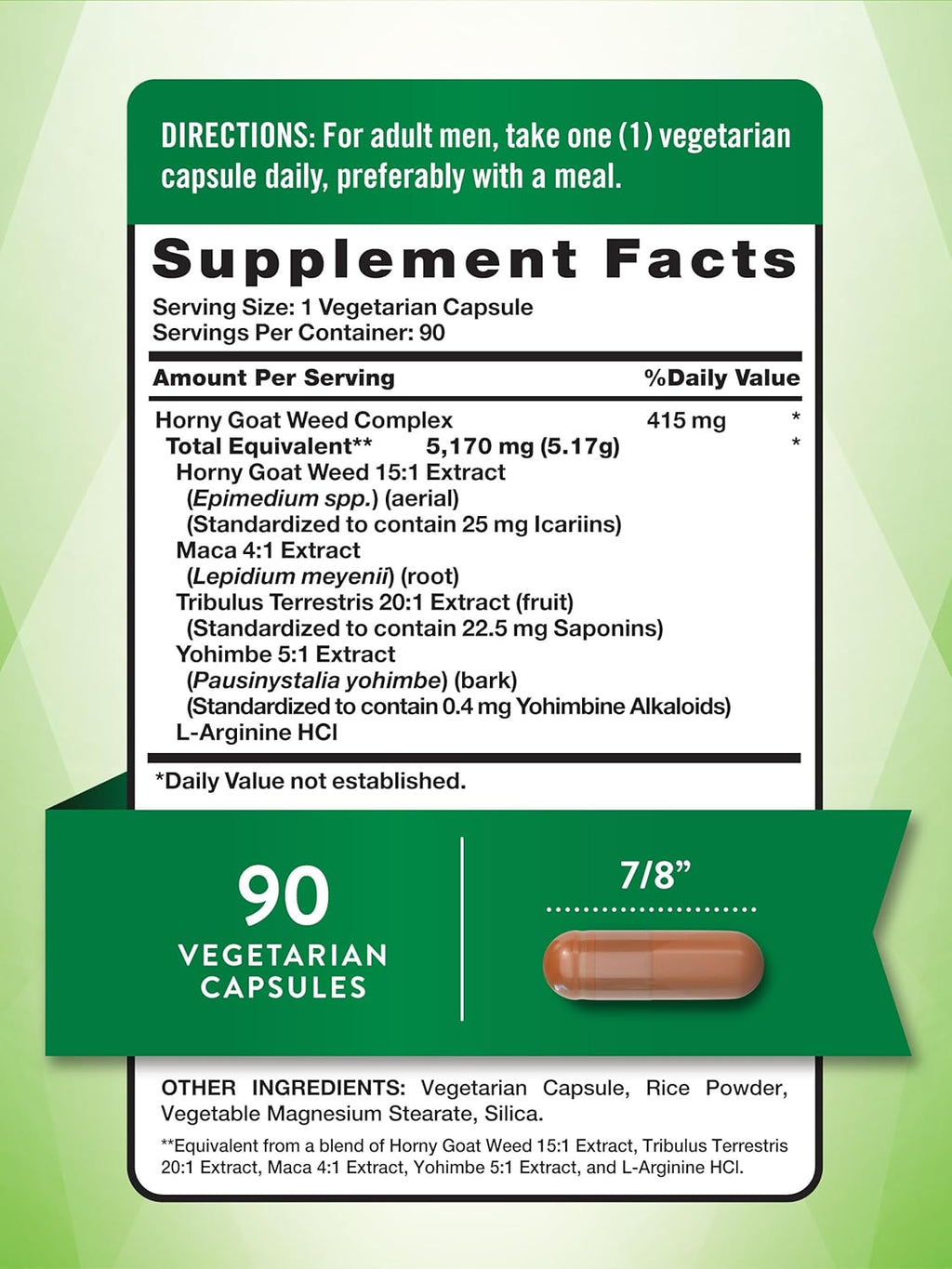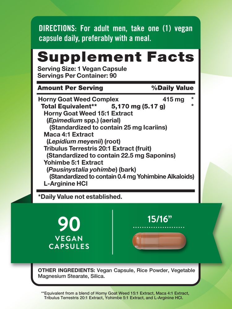 Queste capsule vegane offrono supporto erboristico per gli uomini. Ogni porzione fornisce 415 mg di un complesso di Epimedio, che consiste in Estratto di Epimedio, Estratto di Maca, Estratto di Tribulus Terrestris, Estratto di Yohimbe e L-Arginina HCl.