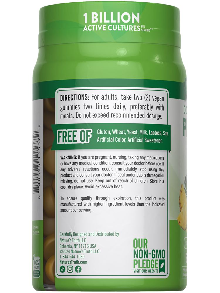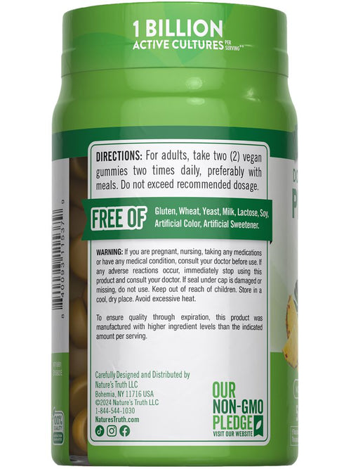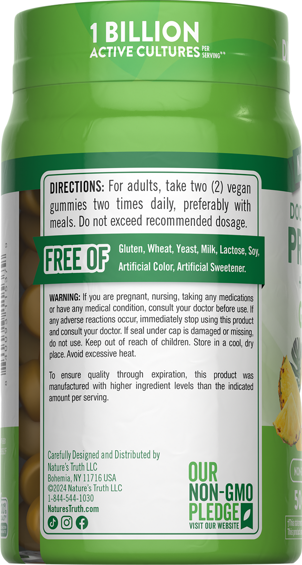 La nostra missione a Nature’s Truth è soddisfare le tue esigenze di benessere con prodotti che vanno oltre le aspettative. Nature’s Truth offre integratori in varie forme di somministrazione, come capsule, softgel, masticabili, compresse, polveri, liquidi e gomme per soddisfare ogni preferenza. Le nostre Gomme Probiotiche + Prebiotiche sono vegane, non OGM, e prive di glutine, grano, lievito, latte, lattosio, soia, coloranti artificiali e dolcificanti artificiali.