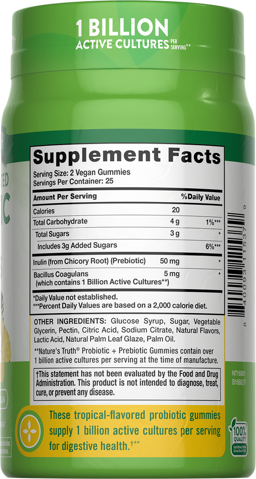 **Le Gomme Probiotiche + Prebiotiche di Nature’s Truth contengono oltre 1 miliardo di colture attive per porzione al momento della produzione.