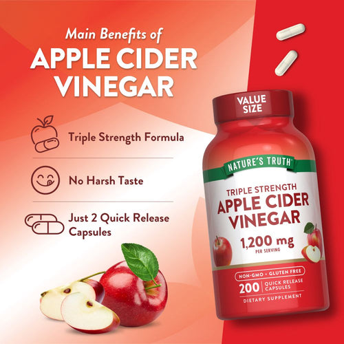 Each serving of our Triple Strength Apple Cider Vinegar capsules delivers 1,200 mg of Apple Cider Vinegar Powder. These convenient capsules are simple to add to your daily routine. Plus, this value size bottle contains 200 quick release capsules, providing you with 100 servings per bottle!