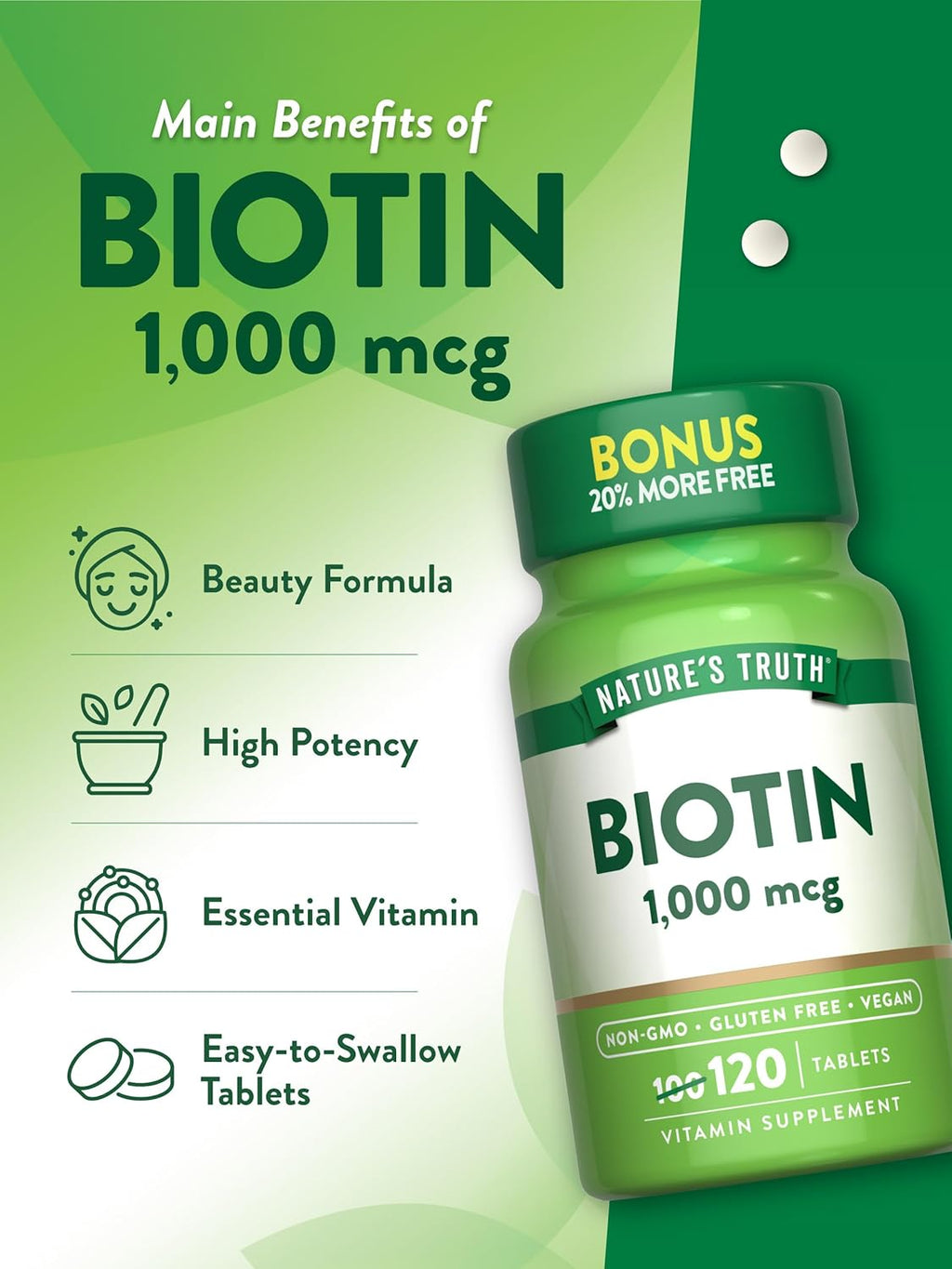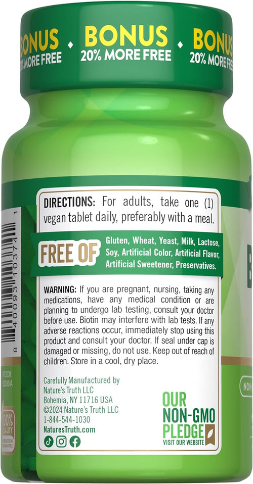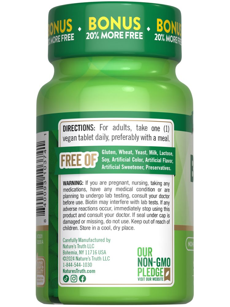 Look no further than Nature's Truth. Easy-to-Take Biotin Tablets Nature's Truth Biotin 1,000 mcg tablets are crafted with the highest quality ingredients. Our superior biotin supplement is a non-GMO product that is packaged and lab checked for quality in the USA. In addition, our biotin is a vegan supplement made without common allergens, including gluten, lactose, milk, yeast, artificial flavor, and preservatives.