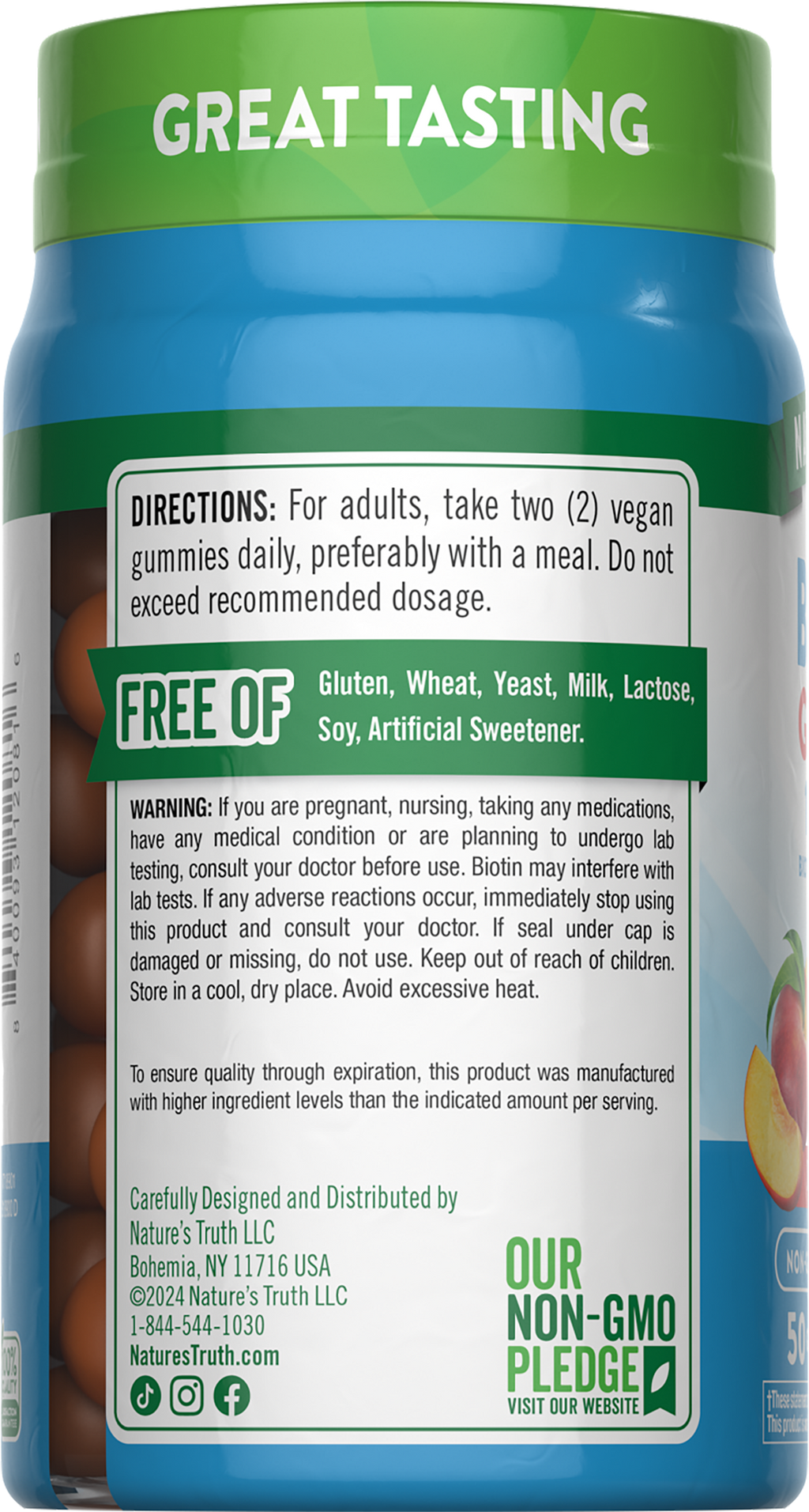 Our mission at Nature’s Truth is to meet your wellness needs with products that go above and beyond. Nature’s Truth provides supplements in various delivery forms, such as capsules, softgels, chewables, tablets, powders, liquids, and gummies to suit every preference. Our Biotin Gummies are vegan, non-GMO, and free of gluten, wheat, yeast, milk, lactose, soy, and artificial sweetener.