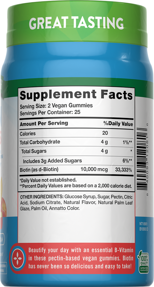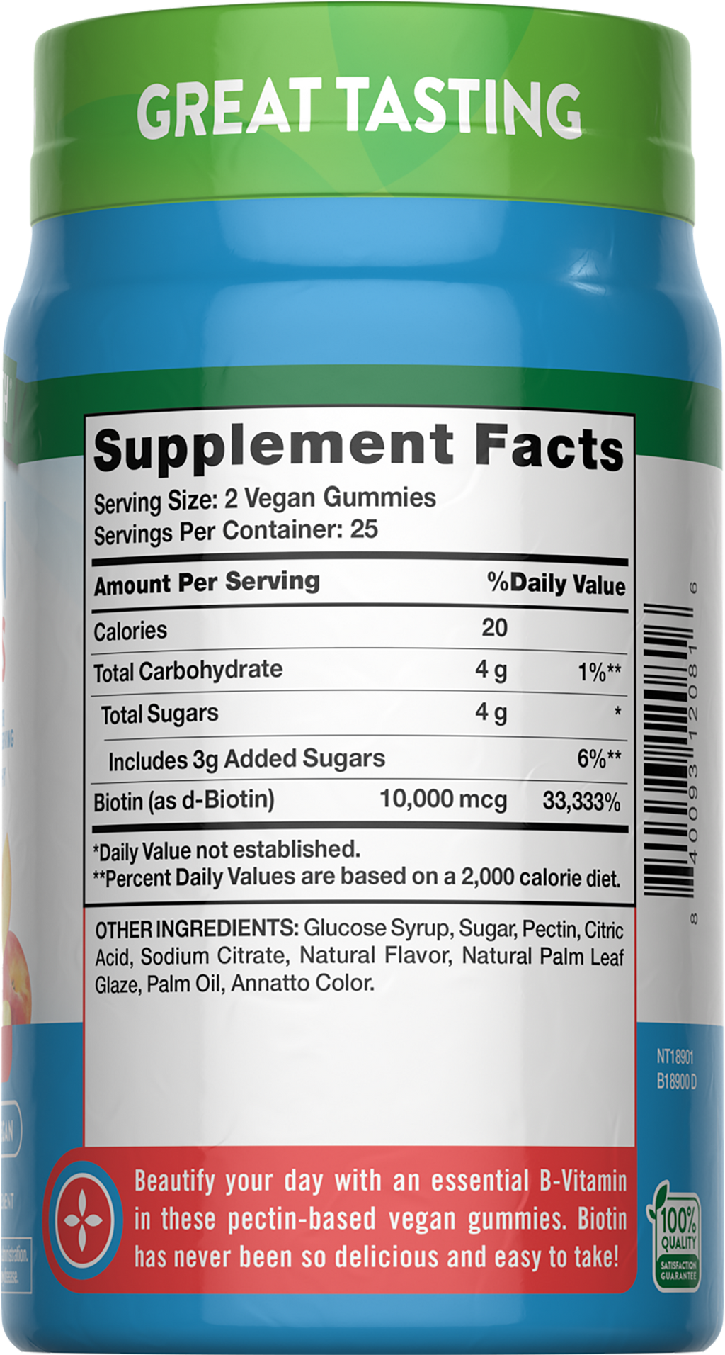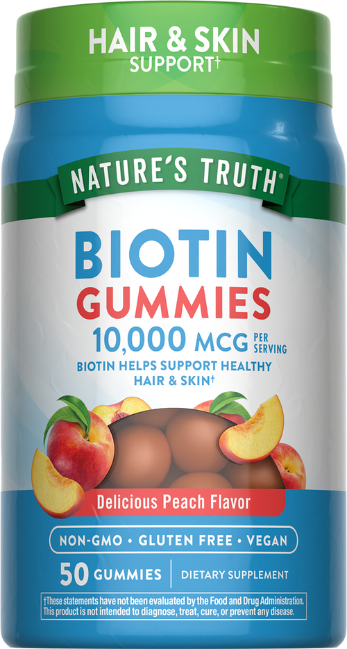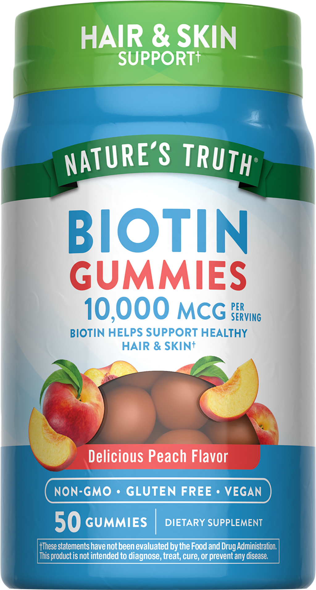 Nature’s Truth Biotin Gummies help support healthy hair and skin, with 10,000 mcg of Biotin per serving in great tasting peach-flavored gummies.† Satisfy your daily requirement for this essential B vitamin with two vegan gummies per day.