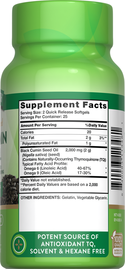 These quick release softgels deliver 2,000 mg of Black Cumin Seed Oil per serving. Our virgin Black Cumin Seed Oil is cold pressed, meaning it is carefully extracted from the seeds using a high-pressure process with no external application of heat. Since no heat or oxygen is used during this specialized method, more of Black Cumin Seed Oil’s natural nutrients can be preserved and delivered to you in these convenient quick release softgels.