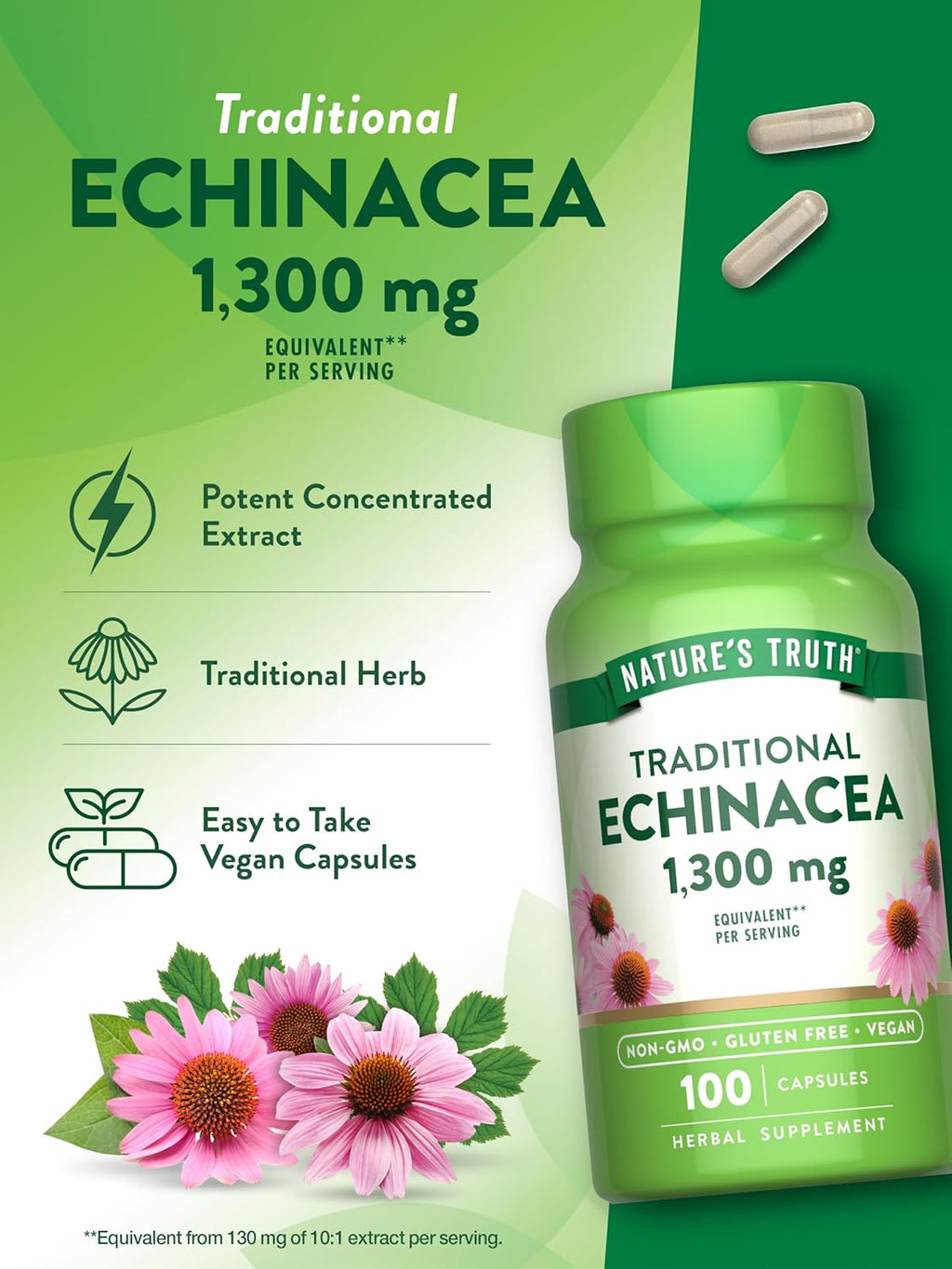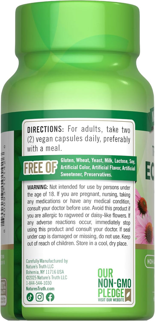 Our mission at Nature’s Truth is to meet your wellness needs with products that go above and beyond. Nature’s Truth provides supplements in various delivery forms, such as capsules, softgels, chewables, tablets, powders, liquids, and gummies to suit every preference. Our Echinacea is vegan, non-GMO, and free of gluten, wheat, yeast, milk, lactose, soy, artificial color, artificial flavor, artificial sweetener, and preservatives.