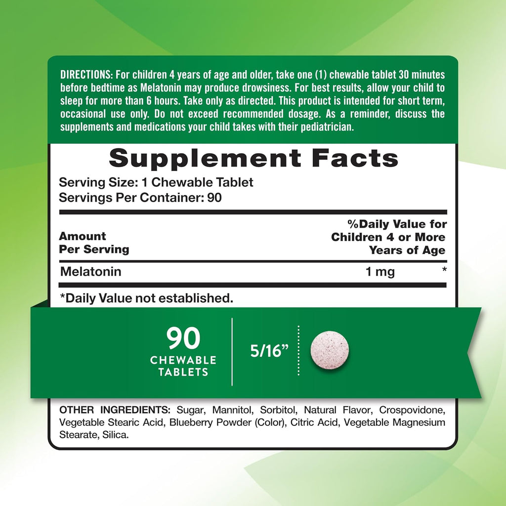 Specifically formulated with little ones’ needs in mind, each vegetarian chewable tablet offers 1 mg of Melatonin in a delicious grape flavor and is 100% drug-free. Children aged four years and older can take one chewable tablet 30 minutes before bedtime to support a peaceful night’s sleep.*