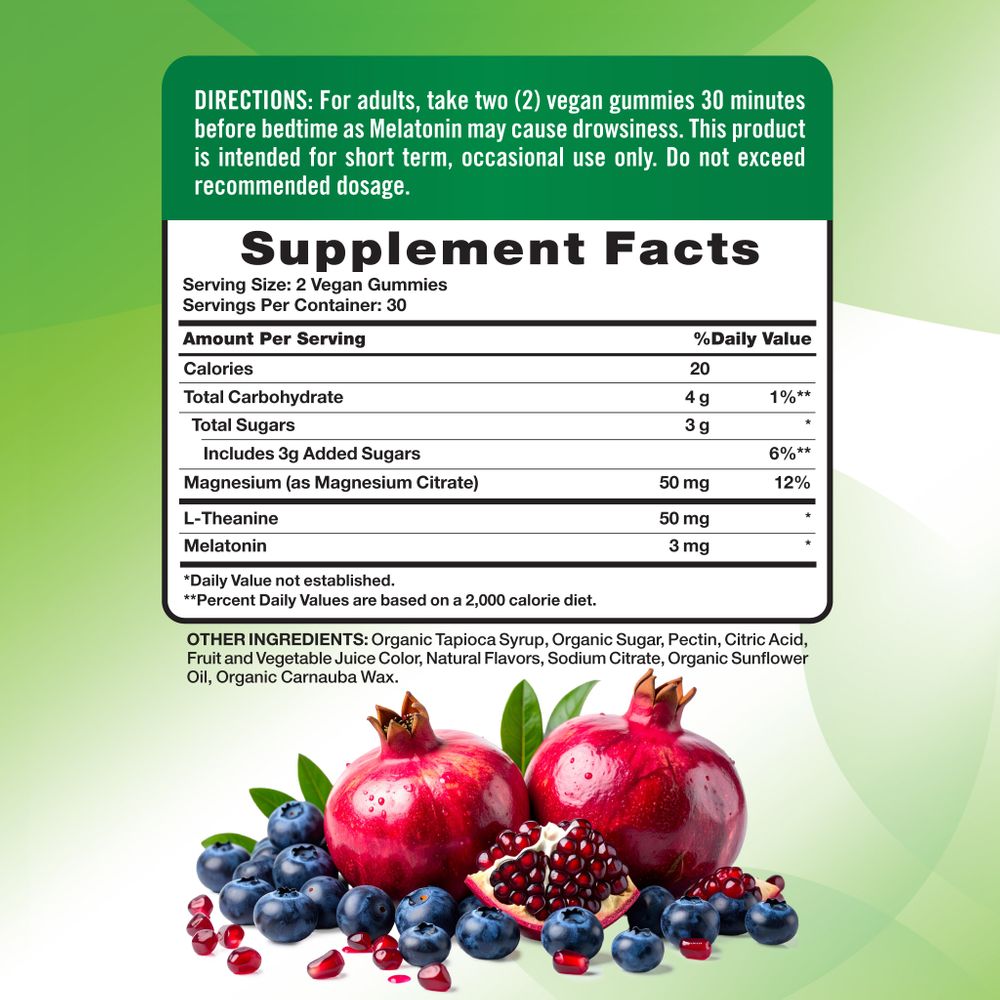 Each serving of our Melatonin + Magnesium gummies delivers 3 mg of Melatonin and 50 mg of Magnesium as Magnesium Citrate. These vegan gummies are enhanced with L-Theanine for added support and have a delicious blueberry pomegranate flavor, making them delightful to take.