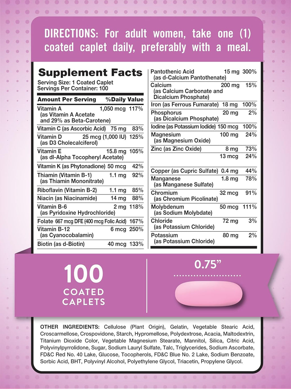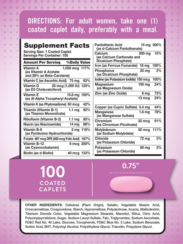 Each serving of our Women’s ABC Complete formula is comprised of more than 20 important vitamins and minerals, 11 of which meet the recommended daily value. Formulated for women specifically, just one easy-to-take coated caplet is all you need each day for reliable support.