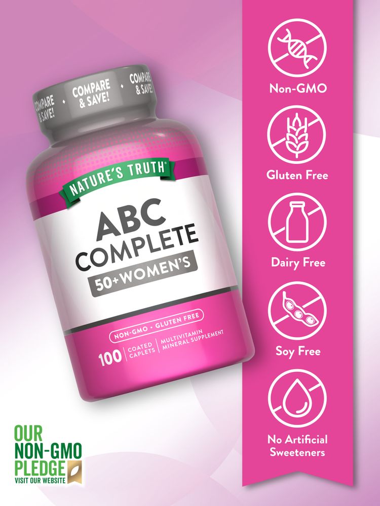 Specially designed for women over 50, our ABC Complete formula delivers more than 20 vitamins and minerals in each serving. Just one coated caplet per day delivers well-rounded support, including the recommended daily value of 14 vitamins and minerals.