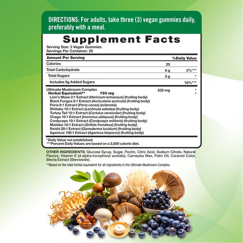 Each serving of Ultimate Mushroom Complex gummies offers the herbal equivalent of 750 mg of a complex featuring extracts from 10 premium mushroom types.** These power-packed vegan gummies are in a delicious blueberry flavor, making them simple to add to your daily routine.