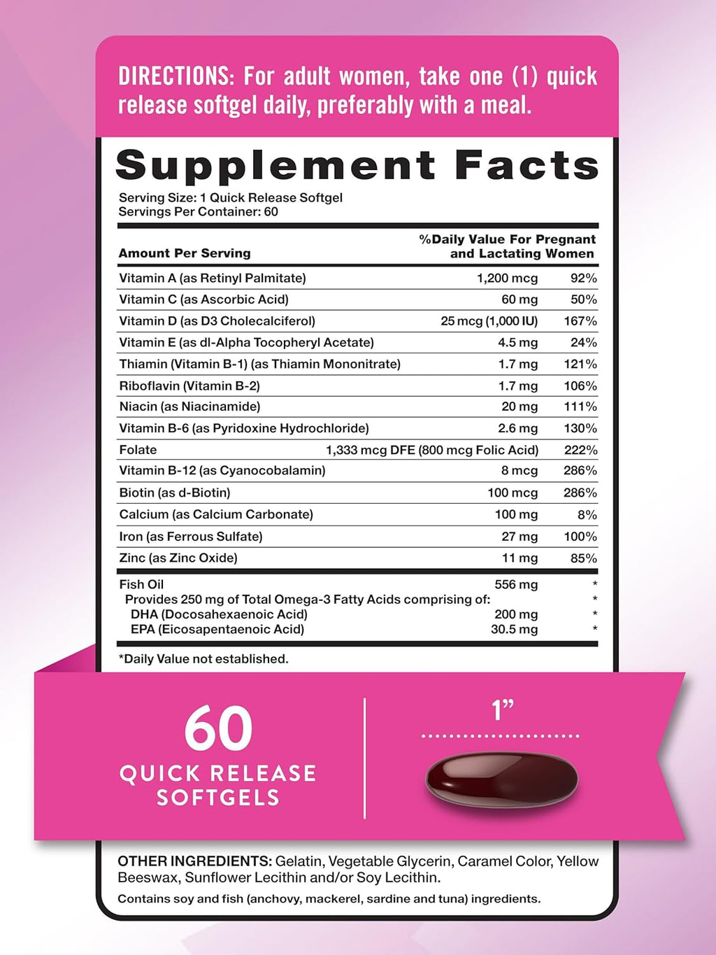 Our Prenatal Multivitamin Softgels contain an array of vitamins and minerals for women before, during, and after pregnancy. Each serving contains 800 mcg Folic Acid as well as 556 mg of Fish Oil, including beneficial DHA and EPA. Just one quick release softgel per day is all you need.