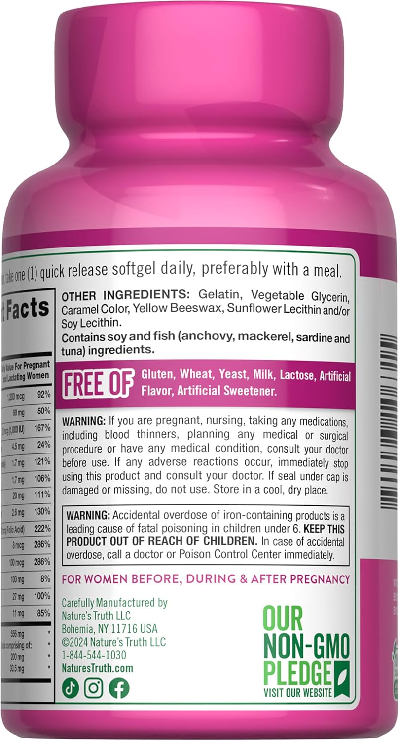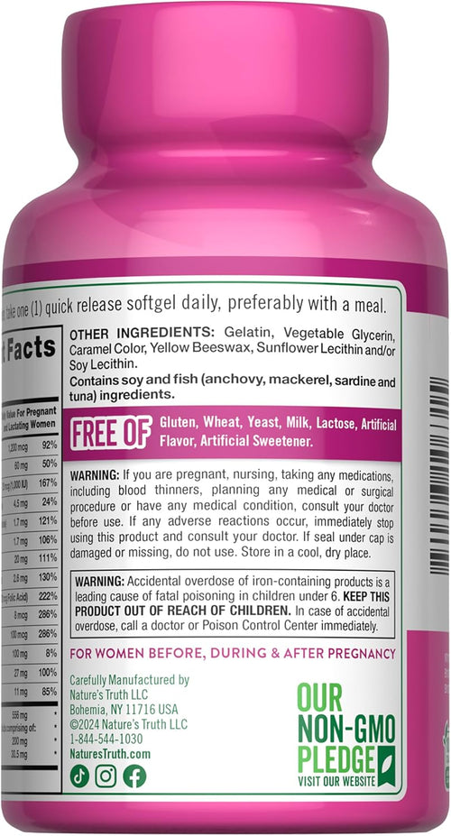 Our mission at Nature’s Truth is to meet your wellness needs with products that go above and beyond. Nature’s Truth provides supplements in various delivery forms, such as capsules, softgels, chewables, tablets, powders, liquids, and gummies to suit every preference. Our Prenatal Multivitamin is non-GMO and free of gluten, wheat, yeast, milk, lactose, artificial flavor, artificial sweetener, and preservatives.
