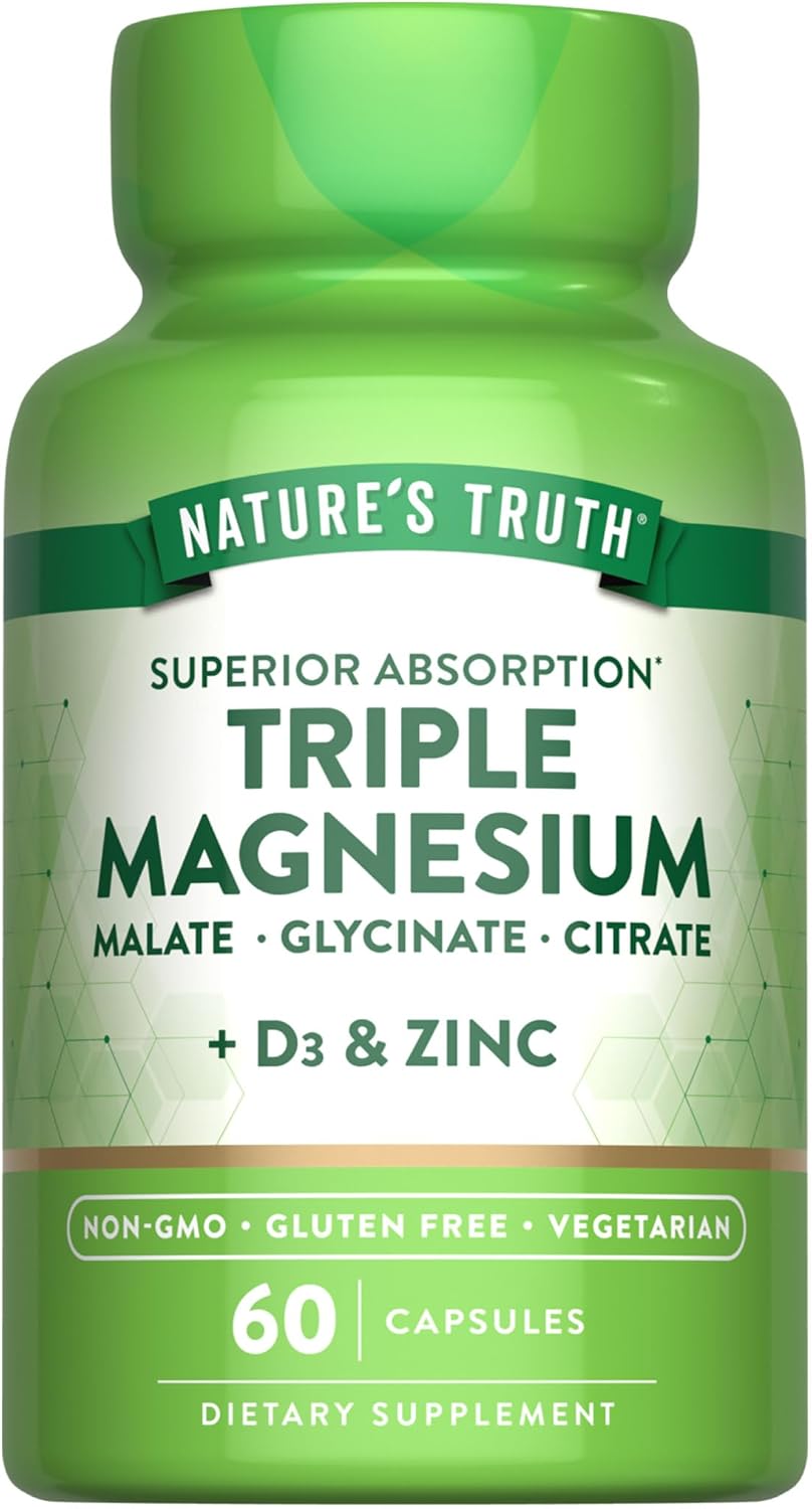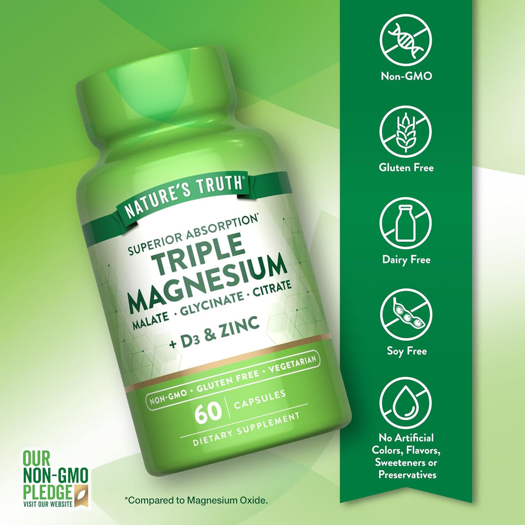 Our Triple Magnesium is a potent blend of three forms of magnesium glycinate, citrate, and malate, providing 210 mg per serving. These vegetarian capsules also deliver high-potency Vitamin D3 and Zinc for well-rounded support. Adults can take two capsules daily to reap the full benefits.