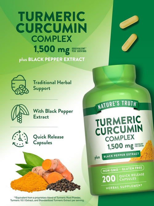 Cada dose destas cápsulas de liberação rápida oferece o equivalente a 1500 mg** de Complexo de Cúrcuma Curcumina, além do Extrato de Pimenta Preta da fruta Piper nigrum, que auxilia na absorção da cúrcuma. A mistura proprietária de cúrcuma curcumina é formulada para conter raiz de cúrcuma, extrato de raiz de cúrcuma e um extrato de cúrcuma da raiz Curcuma longa padronizado para conter 95% de curcuminóides.