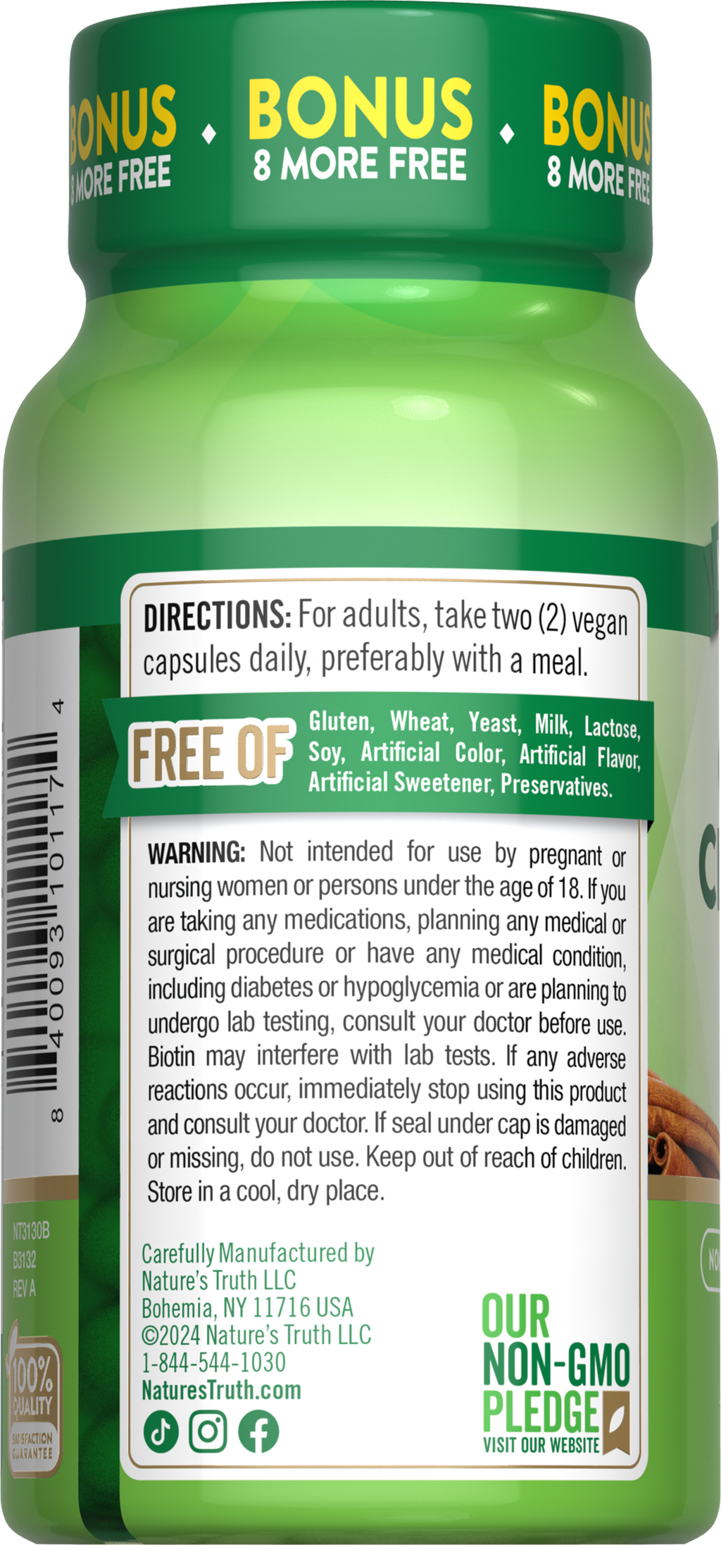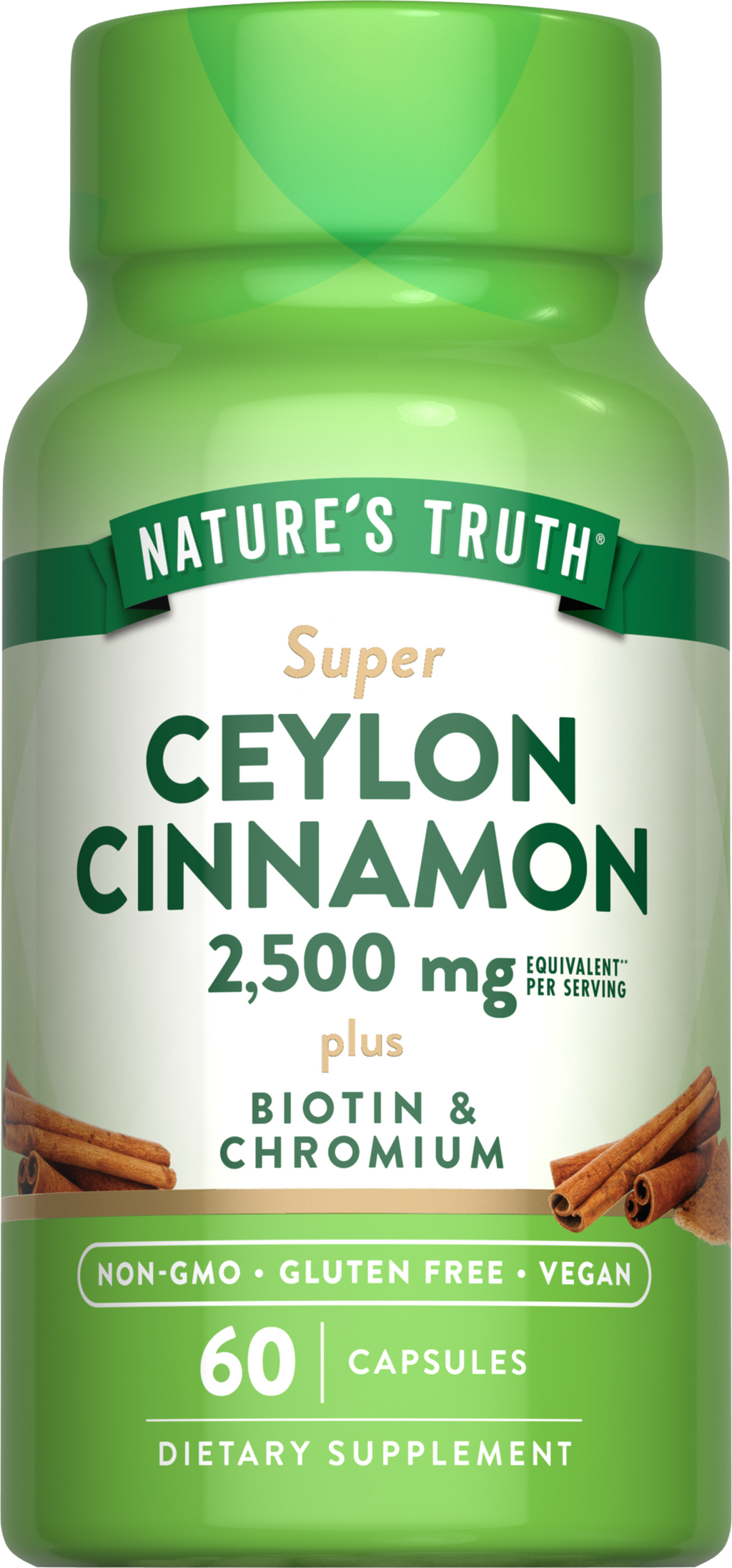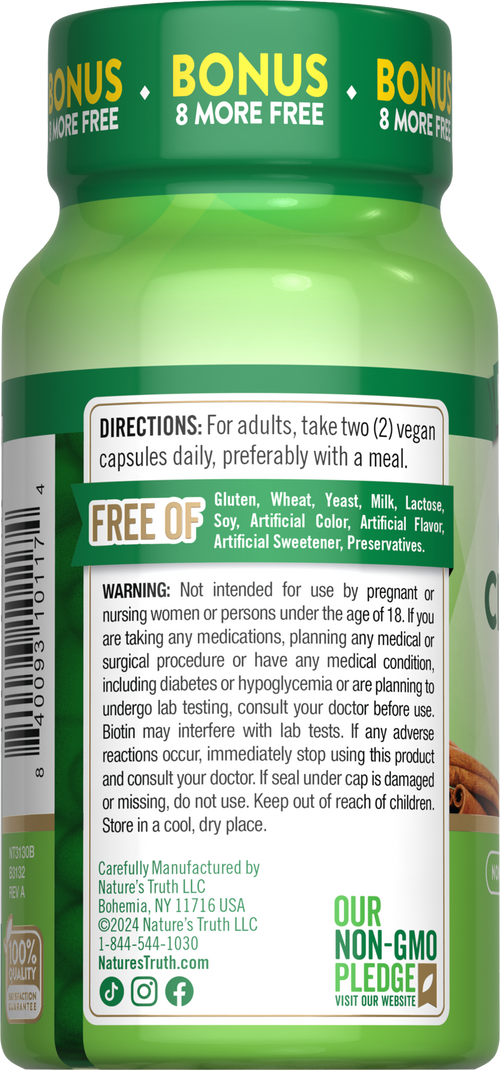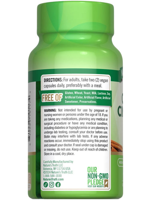 Nossa missão na Nature’s Truth é atender às suas necessidades de bem-estar com produtos que vão além. A Nature’s Truth oferece suplementos em várias formas de administração, como cápsulas, softgels, mastigáveis, comprimidos, pós, líquidos e gomas, para atender todas as preferências. Nossa Canela do Ceilão é não-OGM e livre de glúten, trigo, fermento, leite, lactose, soja, corantes artificiais, sabores artificiais, adoçantes artificiais e conservantes.