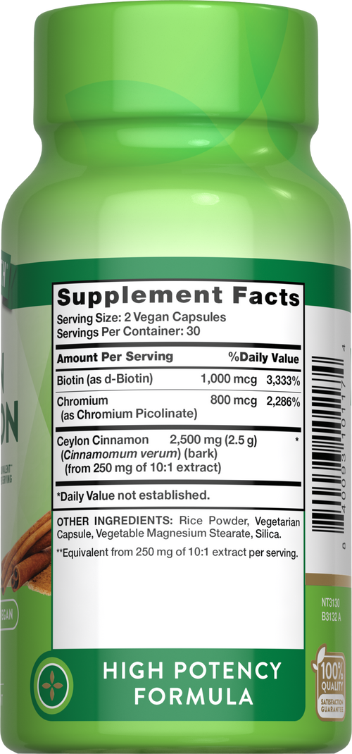 Cada porção de nossas cápsulas de Canela do Ceilão oferece o equivalente a 2.500 mg de Canela do Ceilão.** Estas cápsulas veganas de alta potência são enriquecidas com Biotina e Cromo para suporte adicional. Adultos podem tomar duas cápsulas veganas diariamente para receber todos os benefícios deste suplemento.